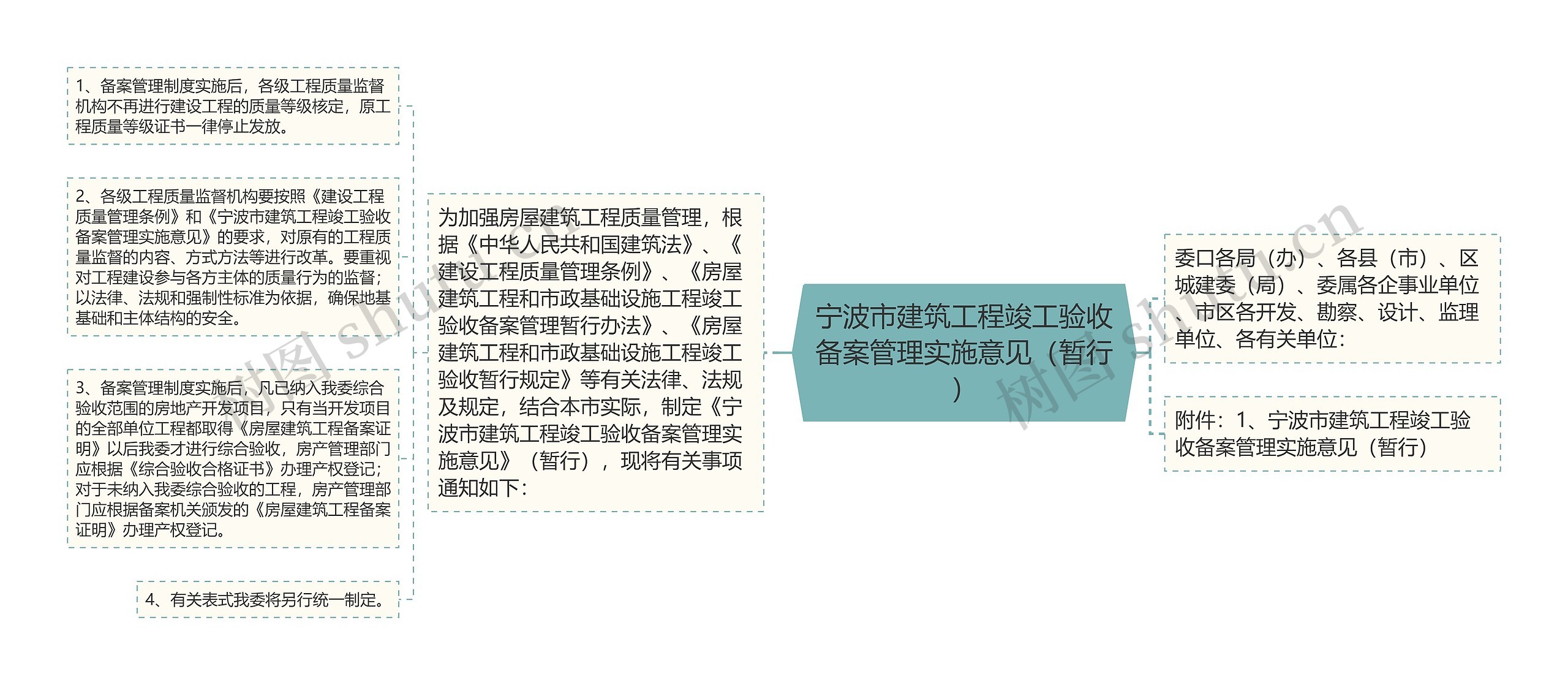 树图思维导图提供《宁波市建筑工程竣工验收备案管理实施意见(暂行)》在线思维导图免费制作,点击“编辑”按钮,可对《宁波市建筑工程竣工验收备案管理实施意见(暂行)》进行在线思维导图编辑,本思维导图属于思维导图模板主题,文件编号是:633dfaae9c17bfbdfa70e5bba60524ee
