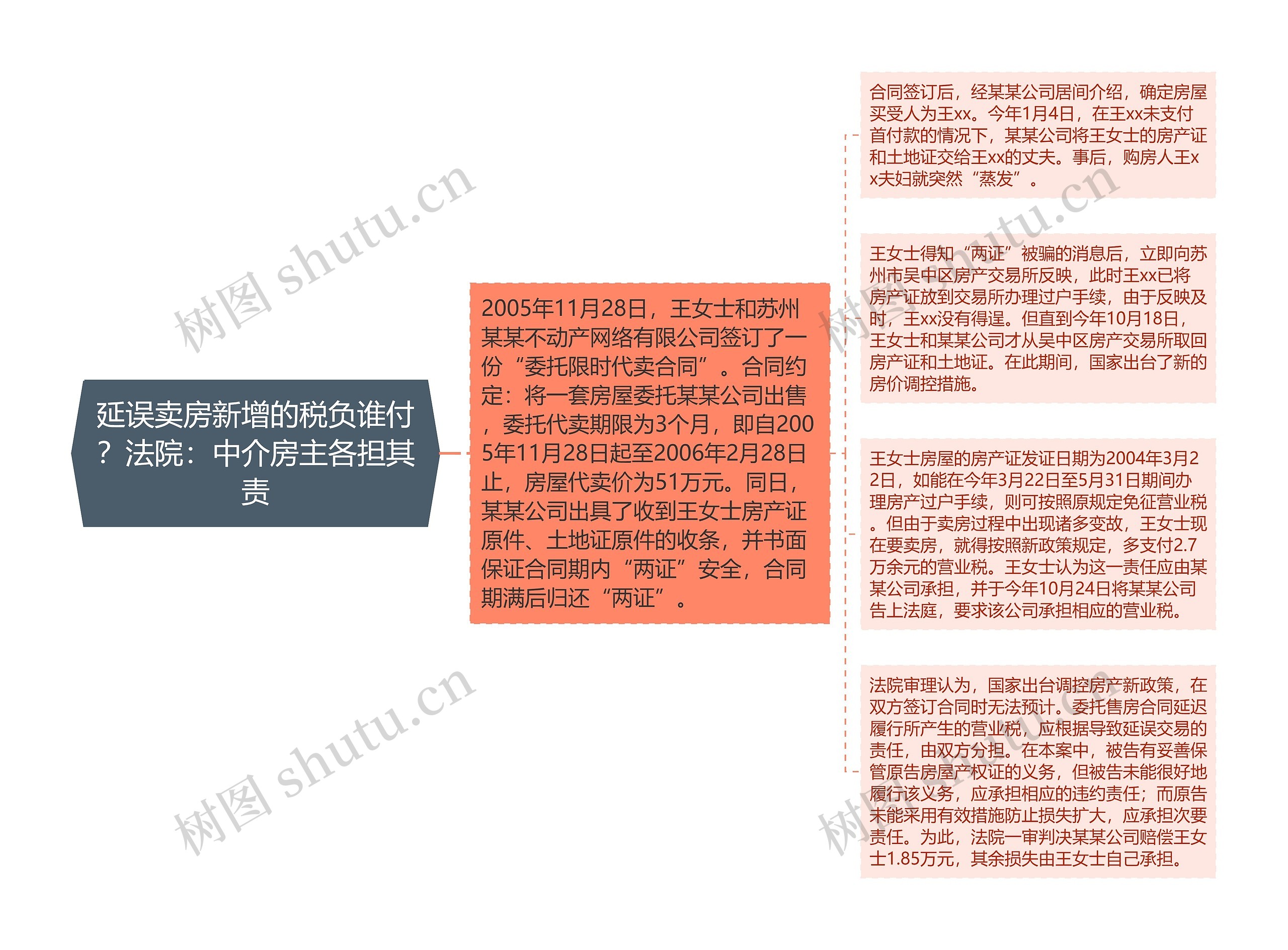 法院审理认为,国家出台调控房产新政策,在双方签订合同时无法预计。委托售房合同延迟履行所产生的营业税,应根据导致延误交易的责任,由双方分担。在本案中,被告有妥善保管原告房屋产权证的义务,但被告未能很好地履行该义务,应承担相应的违约责任;而原告未能采用有效措施防止损失扩大,应承担次要责任。为此,法院一审判决某某公司赔偿王女士1.85万元,其余损失由王女士自己承担。