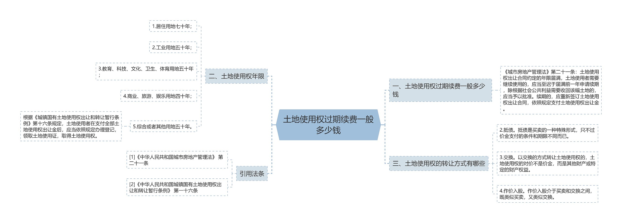 树图思维导图提供《土地使用权过期续费一般多少钱》在线思维导图免费制作,点击“编辑”按钮,可对《土地使用权过期续费一般多少钱》进行在线思维导图编辑,本思维导图属于思维导图模板主题,文件编号是:b7dff9fe0c5dab385304711c36d8e19f