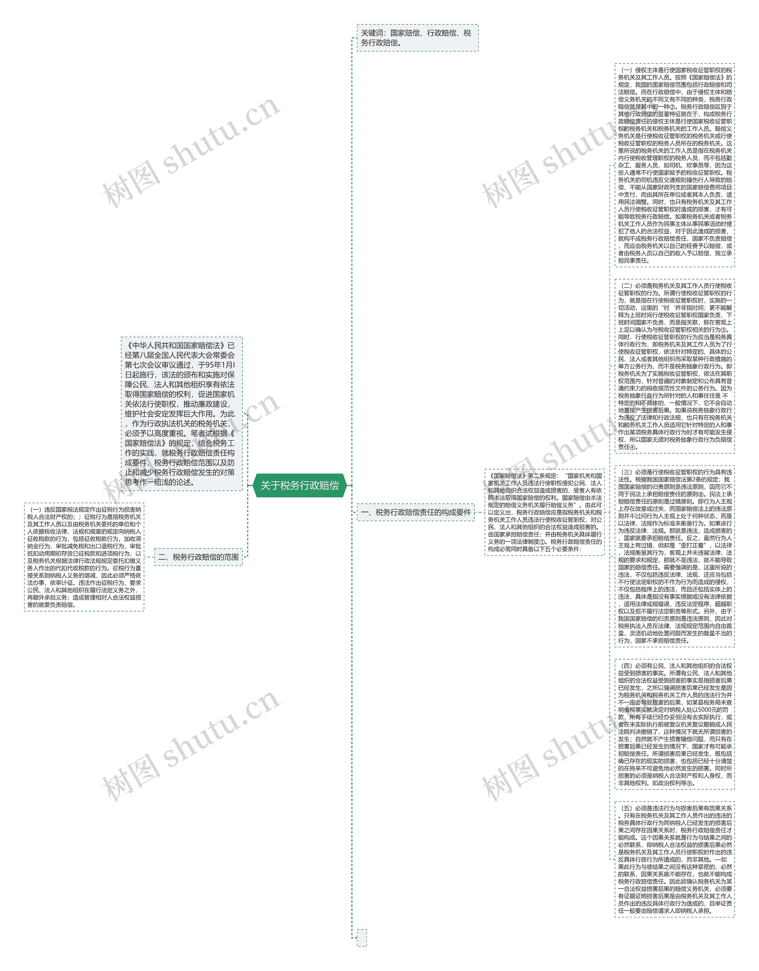 (一)侵权主体是行使国家税收征管职权的税务机关及其工作人员。按照《国家赔偿法》的规定,我国的国家赔偿范围包括行政赔偿和司法赔偿。而在行政赔偿中,由于侵权主体和赔偿义务机关的不同又有不同的种类,税务行政赔偿就是其中的一种②。税务行政赔偿区别于其他行政赔偿的显著特征就在于,构成税务行政赔偿责任的侵权主体是行使国家税收征管职权的税务机关和税务机关的工作人员。赔偿义务机关是行使税收征管职权的税务机关或行使税收征管职权的税务人员所在的税务机关。这里所说的税务机关的工作人员是指在税务机关内行使税收管理职权的税务人员,而不包括勤杂工、服务人员,如司机、炊事员等,因为这些人通常不行使国家赋予的税收征管职权。税务机关的司机违反交通规则撞伤行人导致的赔偿,不能从国家财政列支的国家赔偿费用项目中支付,而由其所在单位或者其本人负责,适用民法调整。同时,也只有税务机关及其工作人员行使税收征管职权时造成的损害,才有可能导致税务行政赔偿。如果税务机关或者税务机关工作人员作为民事主体从事民事活动时侵犯了他人的合法权益,对于因此造成的损害,就构不成税务行政赔偿责任,国家不负责赔偿,而应由税务机关以自己的经费予以赔偿,或者由税务人员以自己的收入予以赔偿,独立承担民事责任。