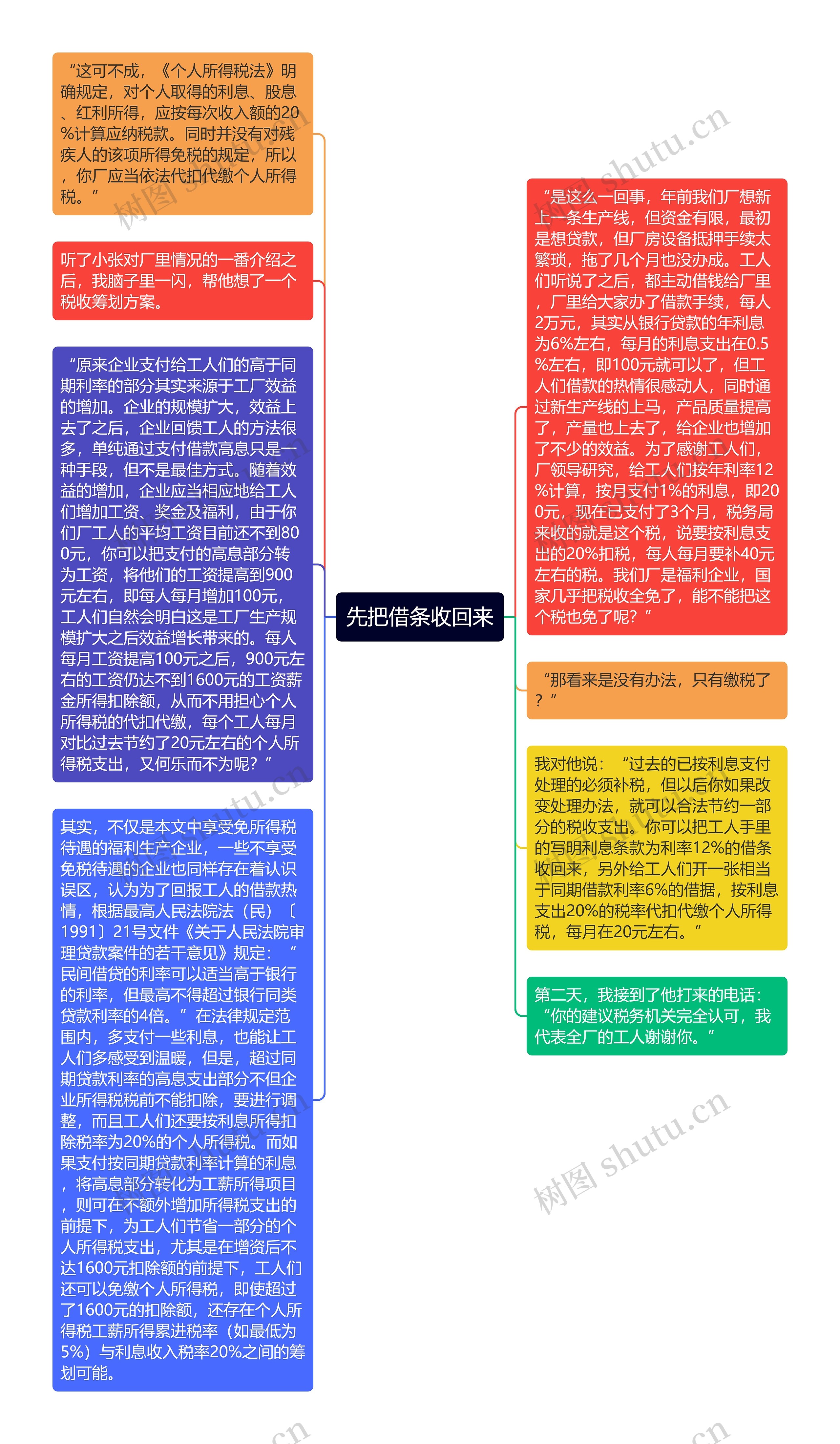 我对他说:“过去的已按利息支付处理的必须补税,但以后你如果改变处理办法,就可以合法节约一部分的税收支出。你可以把工人手里的写明利息条款为利率12%的借条收回来,另外给工人们开一张相当于同期借款利率6%的借据,按利息支出20%的税率代扣代缴个人所得税,每月在20元左右。”