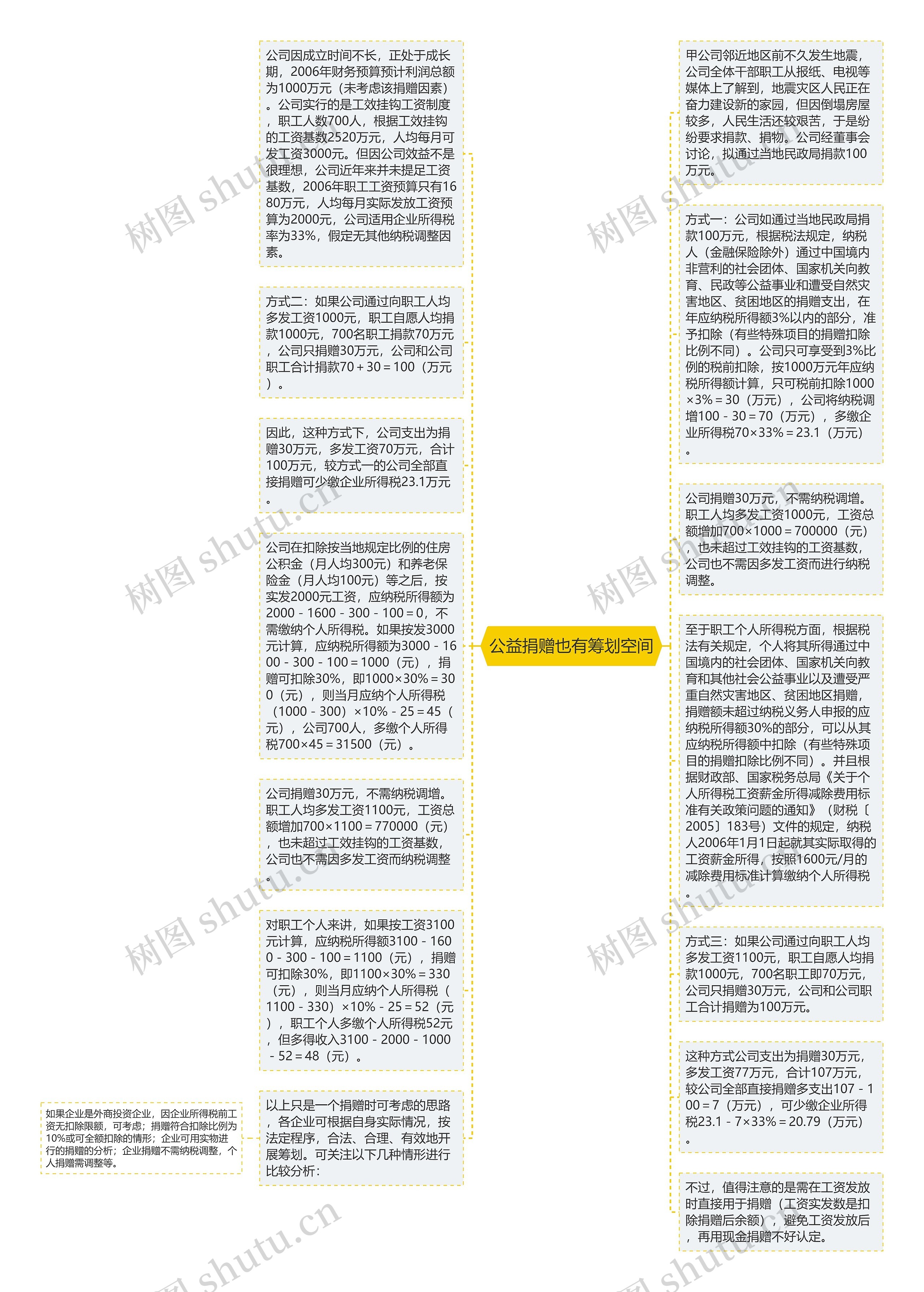 这种方式公司支出为捐赠30万元,多发工资77万元,合计107万元,较公司全部直接捐赠多支出107-100=7(万元),可少缴企业所得税23.1-7×33%=20.79(万元)。