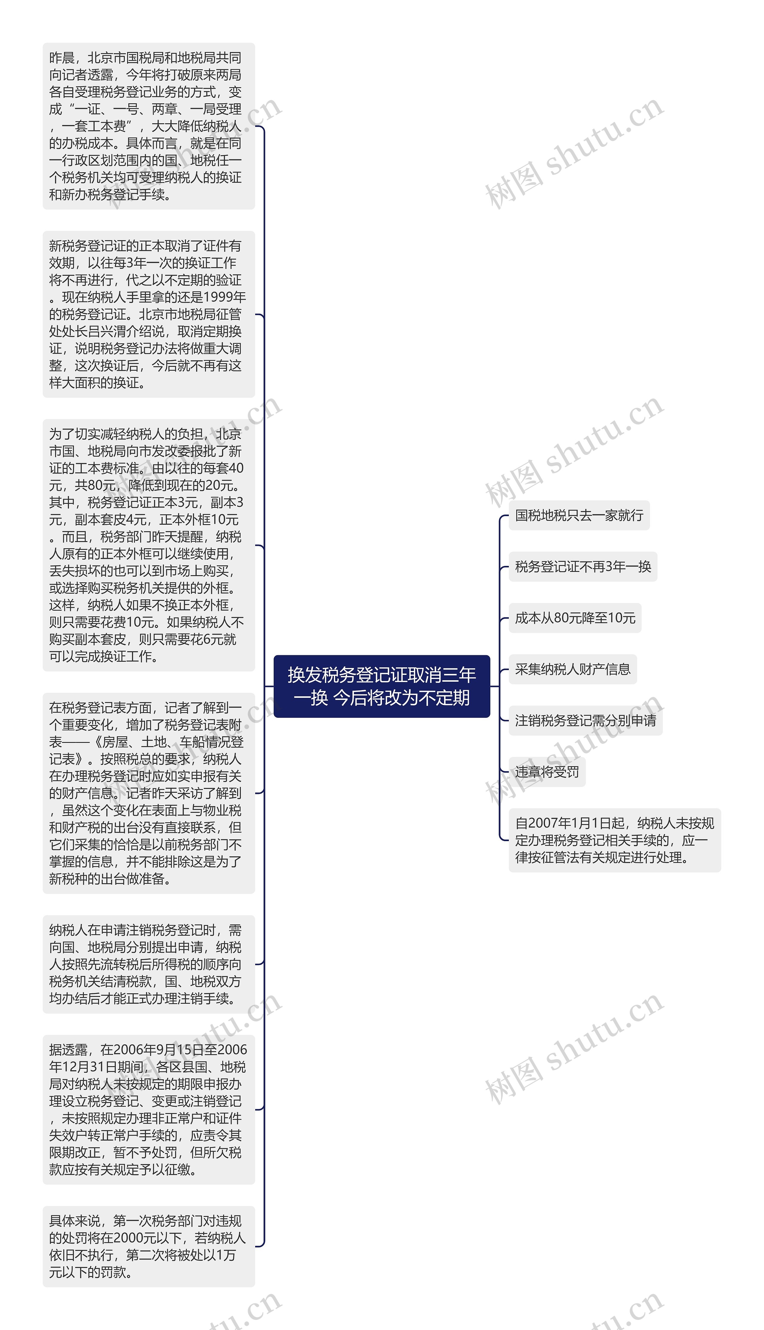 新税务登记证的正本取消了证件有效期,以往每3年一次的换证工作将不再进行,代之以不定期的验证。现在纳税人手里拿的还是1999年的税务登记证。北京市地税局征管处处长吕兴渭介绍说,取消定期换证,说明税务登记办法将做重大调整,这次换证后,今后就不再有这样大面积的换证。