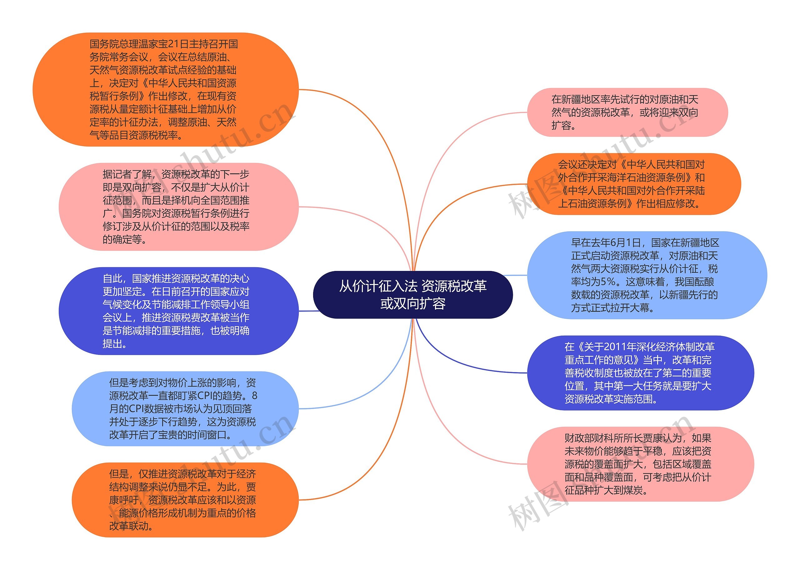 国务院总理温家宝21日主持召开国务院常务会议,会议在总结原油、天然气资源税改革试点经验的基础上,决定对《中华人民共和国资源税暂行条例》作出修改,在现有资源税从量定额计征基础上增加从价定率的计征办法,调整原油、天然气等品目资源税税率。