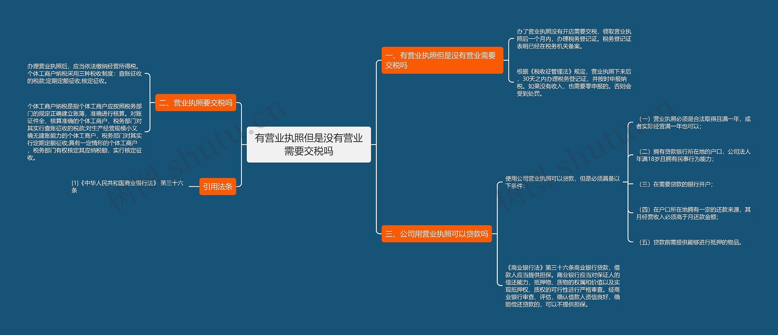 树图思维导图提供《有营业执照但是没有营业需要交税吗》在线思维导图免费制作,点击“编辑”按钮,可对《有营业执照但是没有营业需要交税吗》进行在线思维导图编辑,本思维导图属于思维导图模板主题,文件编号是:8f0c0cda014a4f504922db58005314b5