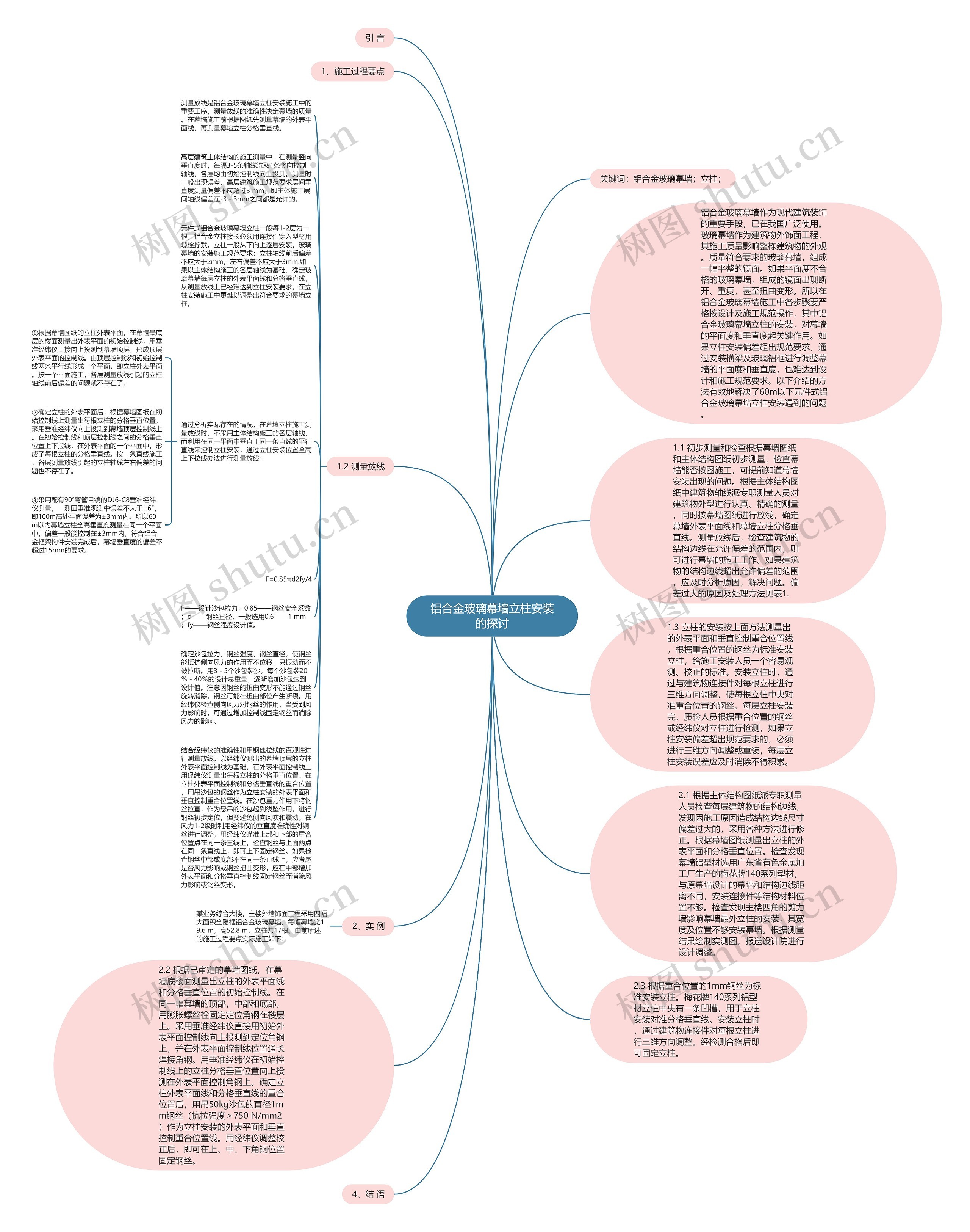 2.2 根据已审定的幕墙图纸,在幕墙底楼面测量出立柱的外表平面线和分格垂直位置的初始控制线。在同一幅幕墙的顶部,中部和底部,用膨胀螺丝栓固定定位角钢在楼层上。采用垂准经纬仪直接用初始外表平面控制线向上投测到定位角钢上,并在外表平面控制线位置通长焊接角钢。用垂准经纬仪在初始控制线上的立柱分格垂直位置向上投测在外表平面控制角钢上。确定立柱外表平面线和分格垂直线的重合位置后,用吊50kg沙包的直径1mm钢丝(抗拉强度>750 N/mm2)作为立柱安装的外表平面和垂直控制重合位置线。用经纬仪调整校正后,即可在上、中、下角钢位置固定钢丝。