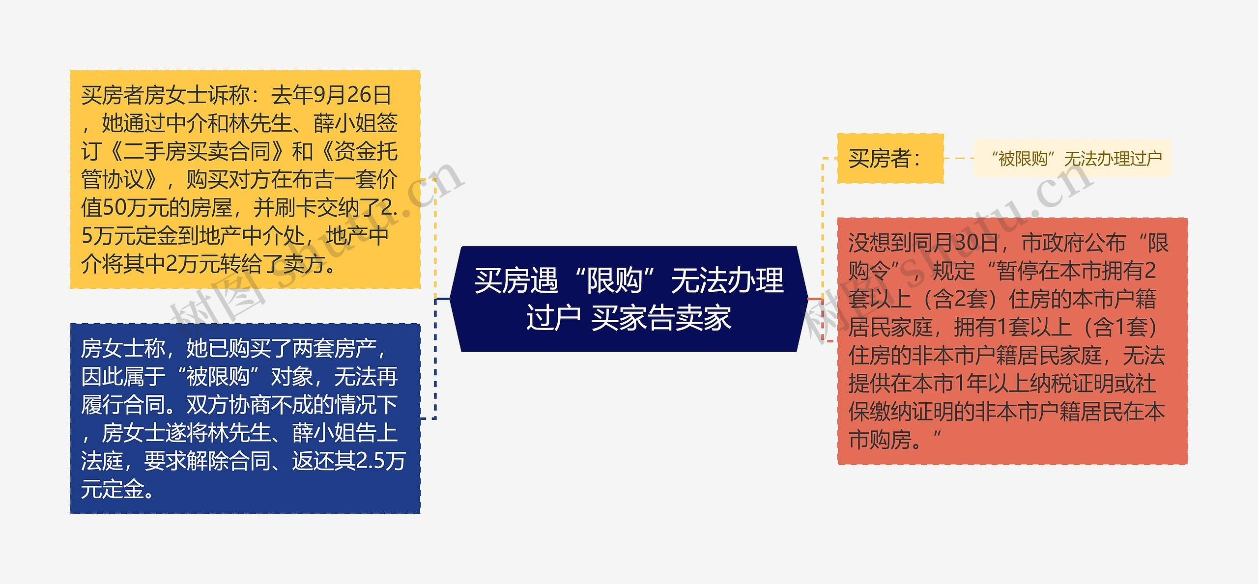 树图思维导图提供《买房遇“限购”无法办理过户 买家告卖家》在线思维导图免费制作,点击“编辑”按钮,可对《买房遇“限购”无法办理过户 买家告卖家》进行在线思维导图编辑,本思维导图属于思维导图模板主题,文件编号是:1f390602f8b1d6bb68cd22e23f3c8d90