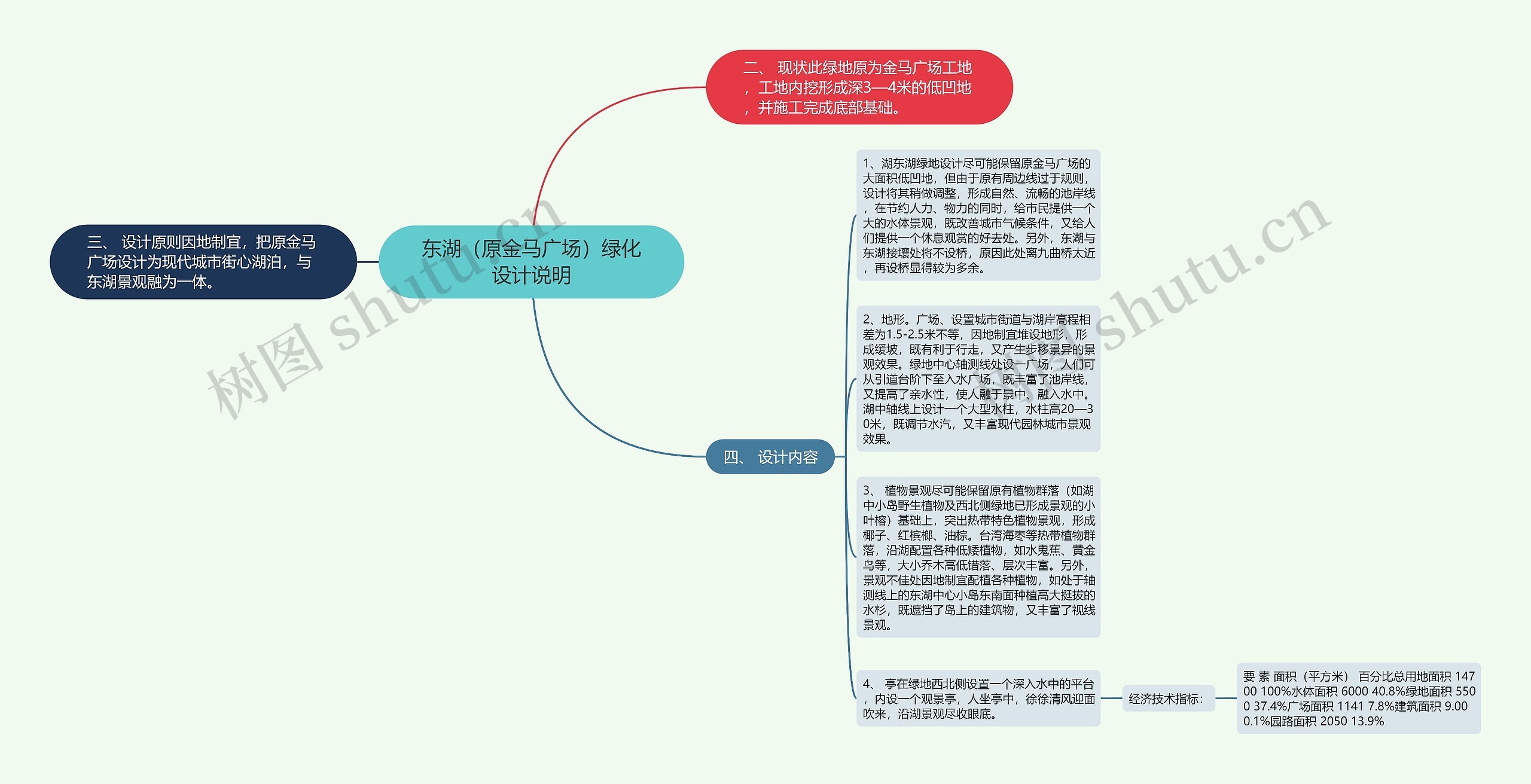 要 素 面积(平方米) 百分比总用地面积 14700 100%水体面积 6000 40.8%绿地面积 5500 37.4%广场面积 1141 7.8%建筑面积 9.00 0.1%园路面积 2050 13.9%