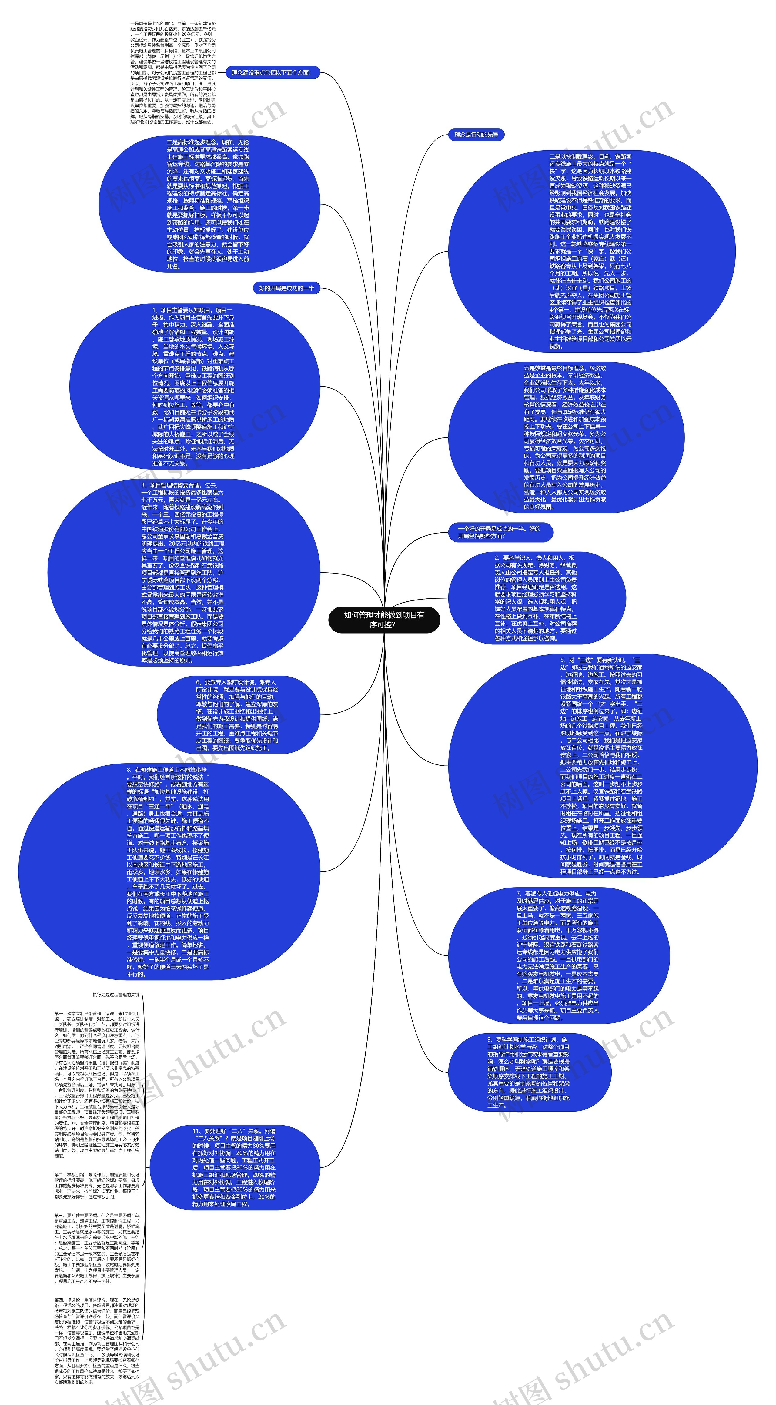 11、要处理好“二八”关系。何谓“二八关系”?就是项目刚刚上场的时候,项目主管的精力80%要用在抓好对外协调,20%的精力用在对内处理一些问题。工程正式开工后,项目主管要把80%的精力用在抓施工组织和现场管理,20%的精力用在对外协调。工程进入收尾阶段,项目主管要把80%的精力用来抓变更索赔和资金到位上,20%的精力用来处理收尾工程。