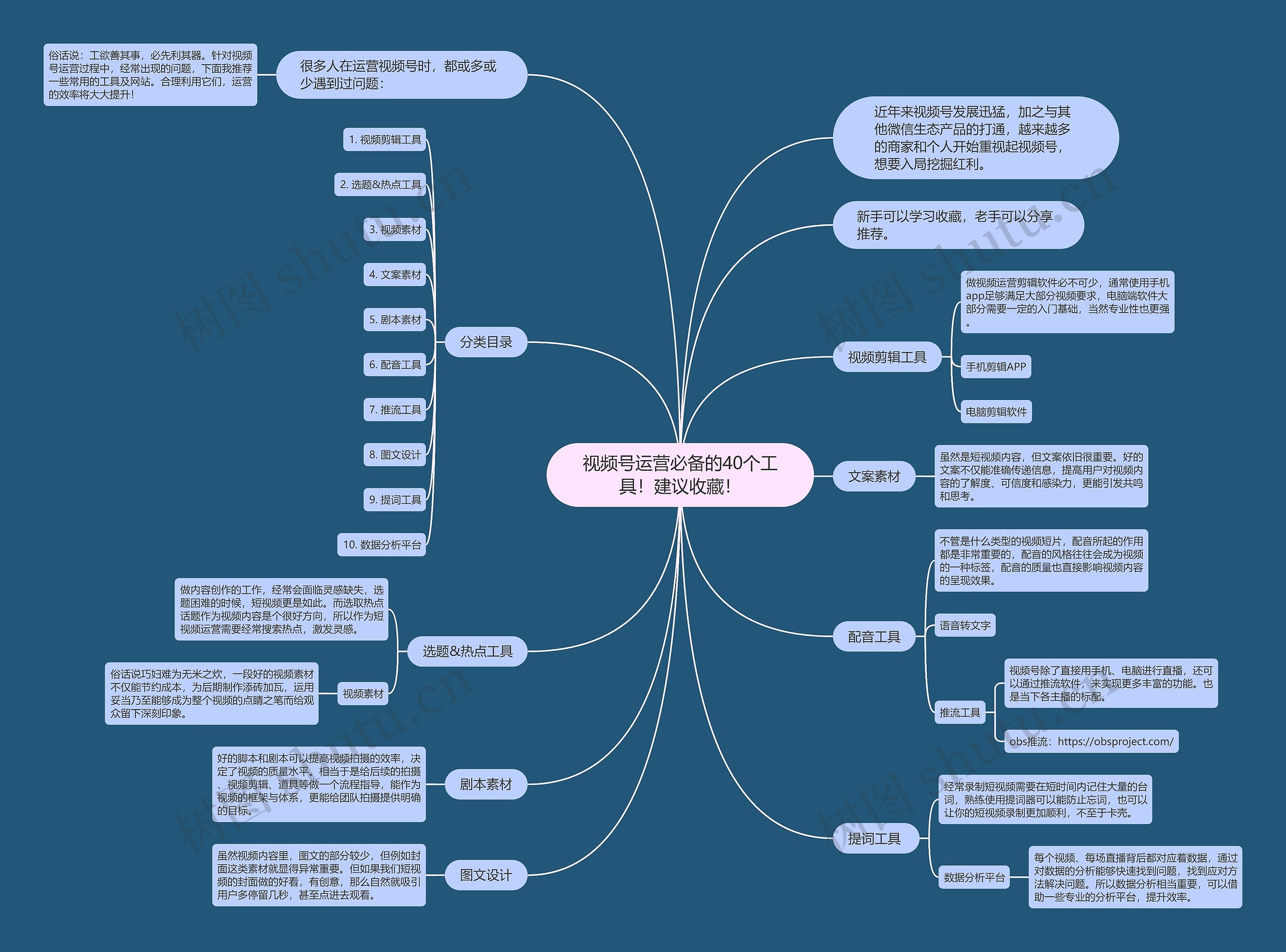 树图思维导图提供《视频号运营必备的40个工具!建议收藏!》在线思维导图免费制作,点击“编辑”按钮,可对《视频号运营必备的40个工具!建议收藏!》进行在线思维导图编辑,本思维导图属于思维导图模板主题,文件编号是:2363d8a2c095c81d4c24d066603c4f85