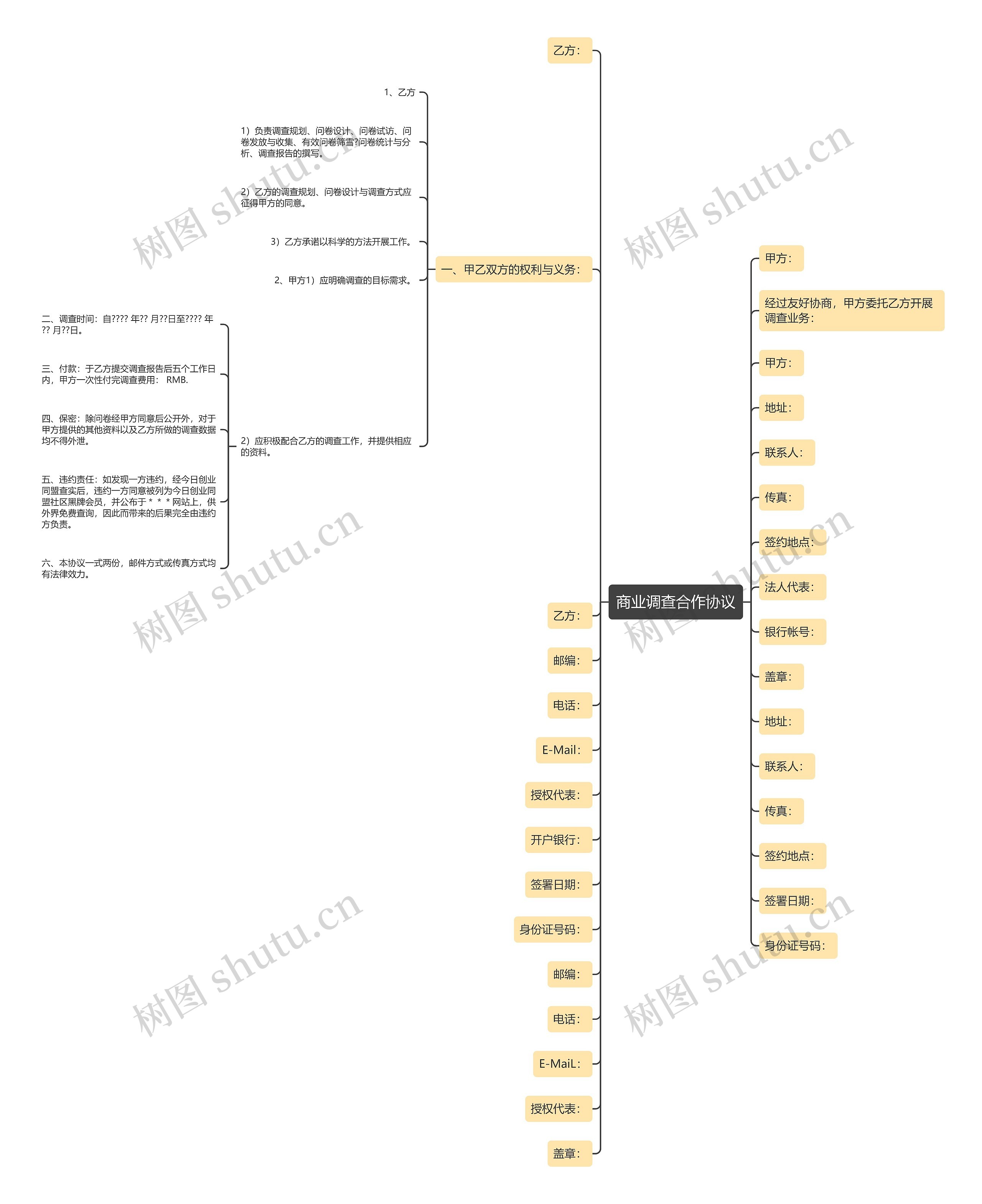 树图思维导图提供《商业调查合作协议》在线思维导图免费制作,点击“编辑”按钮,可对《商业调查合作协议》进行在线思维导图编辑,本思维导图属于思维导图模板主题,文件编号是:aefc46f224ffe259c32fa3068bcf62d9