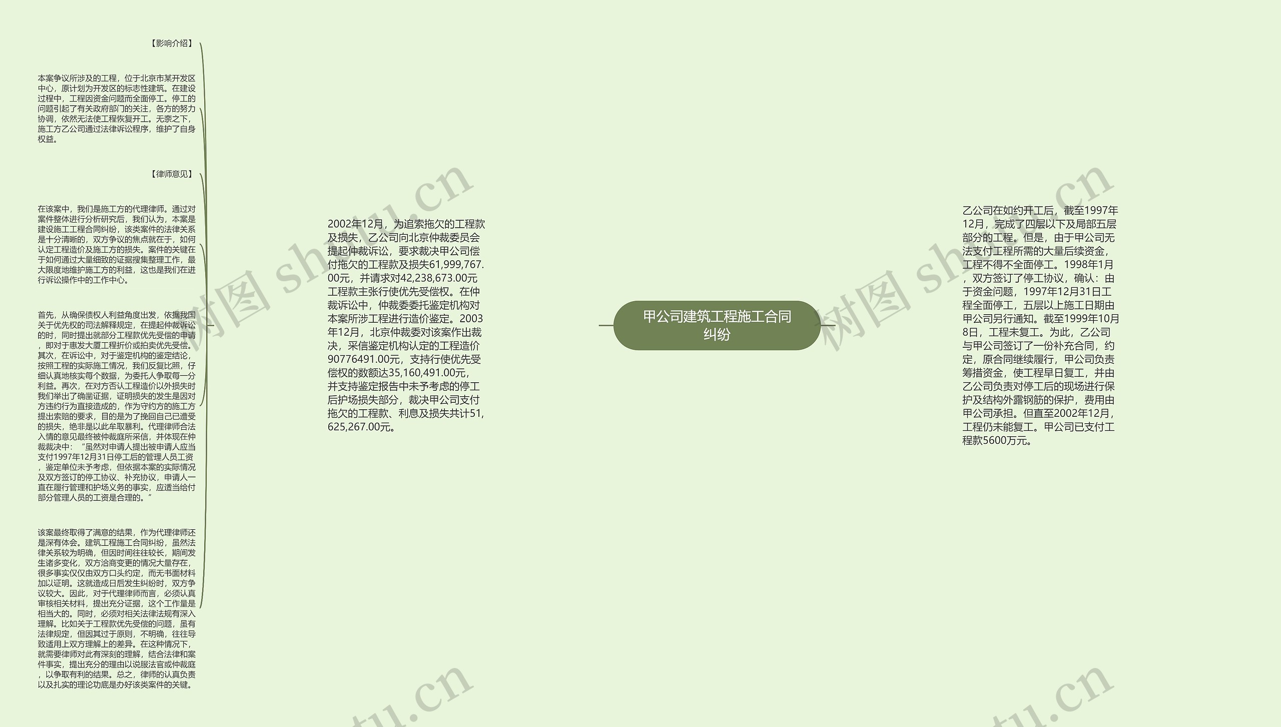 该案最终取得了满意的结果,作为代理律师还是深有体会。建筑工程施工合同纠纷,虽然法律关系较为明确,但因时间往往较长,期间发生诸多变化,双方洽商变更的情况大量存在,很多事实仅仅由双方口头约定,而无书面材料加以证明。这就造成日后发生纠纷时,双方争议较大。因此,对于代理律师而言,必须认真审核相关材料,提出充分证据,这个工作量是相当大的。同时,必须对相关法律法规有深入理解。比如关于工程款优先受偿的问题,虽有法律规定,但因其过于原则,不明确,往往导致适用上双方理解上的差异。在这种情况下,就需要律师对此有深刻的理解,结合法律和案件事实,提出充分的理由以说服法官或仲裁庭,以争取有利的结果。总之,律师的认真负责以及扎实的理论功底是办好该类案件的关键。