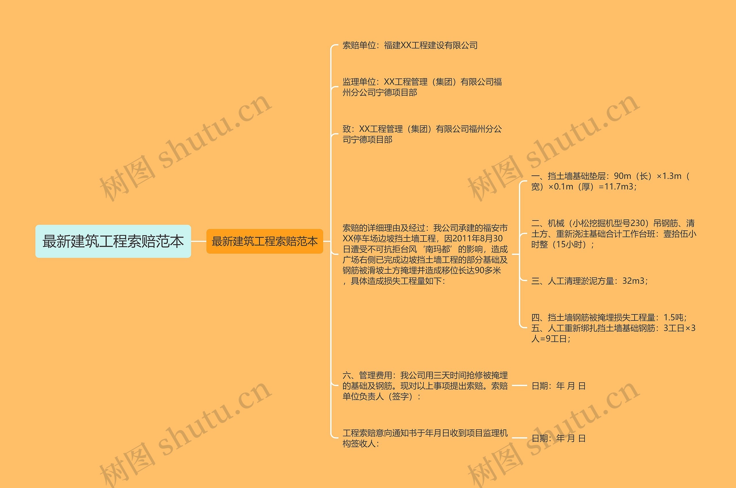 树图思维导图提供《最新建筑工程索赔范本》在线思维导图免费制作,点击“编辑”按钮,可对《最新建筑工程索赔范本》进行在线思维导图编辑,本思维导图属于思维导图模板主题,文件编号是:f1eafa800fae83fd63de538486444681