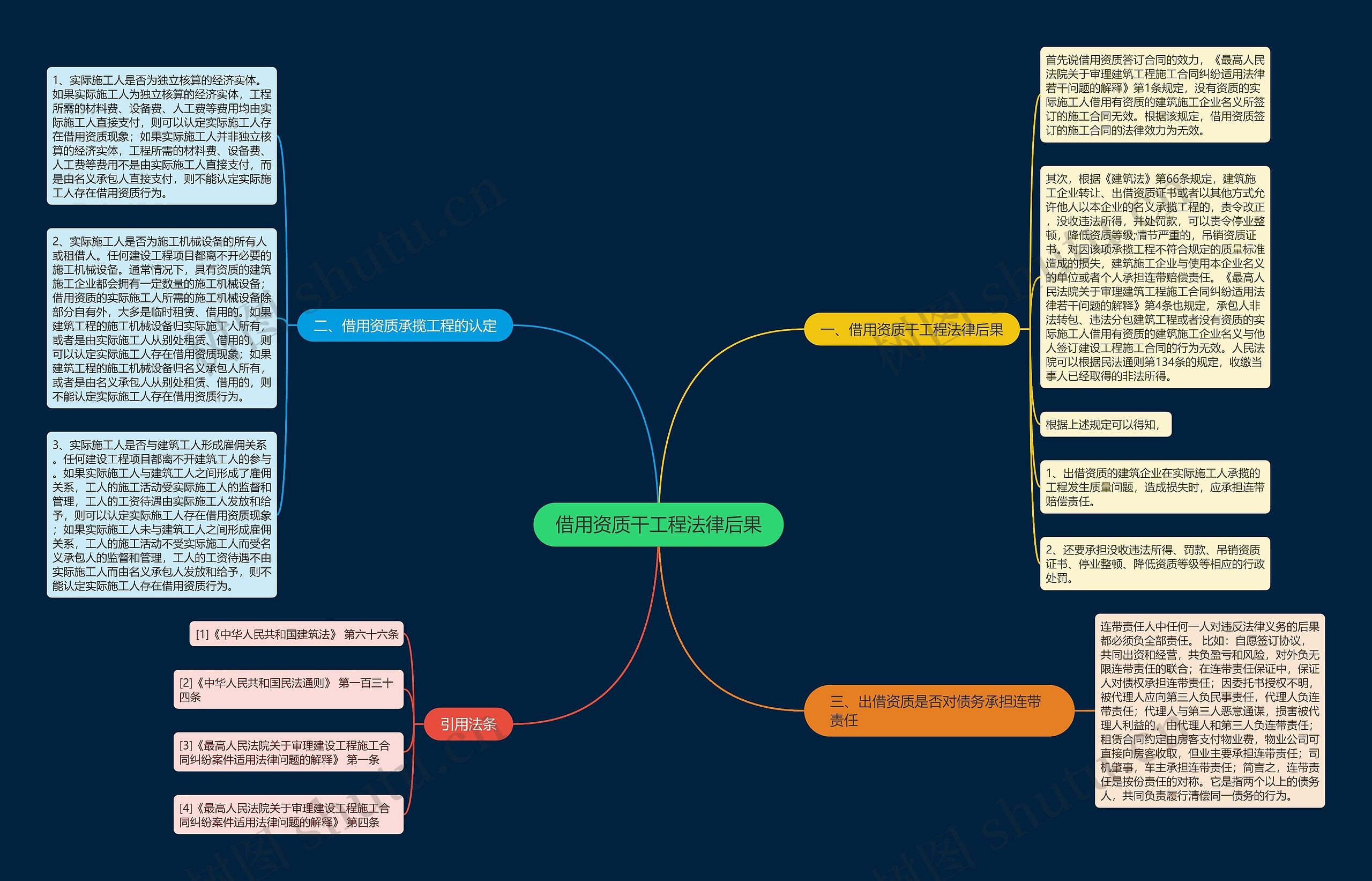 树图思维导图提供《借用资质干工程法律后果》在线思维导图免费制作,点击“编辑”按钮,可对《借用资质干工程法律后果》进行在线思维导图编辑,本思维导图属于思维导图模板主题,文件编号是:d64fc9d84c6e620be6e59041317bcf1e