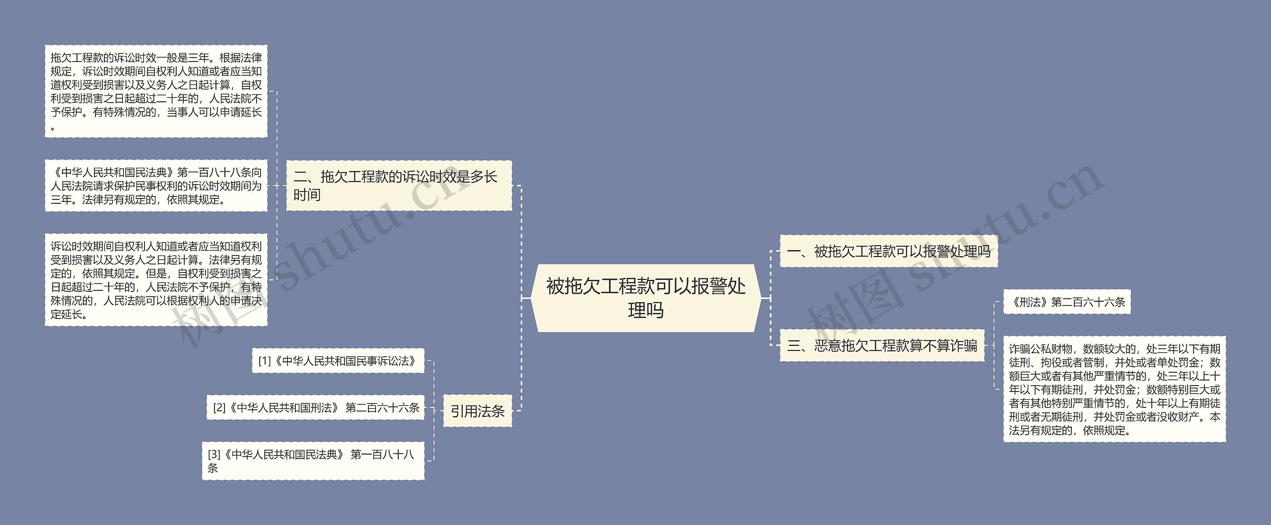 树图思维导图提供《被拖欠工程款可以报警处理吗》在线思维导图免费制作,点击“编辑”按钮,可对《被拖欠工程款可以报警处理吗》进行在线思维导图编辑,本思维导图属于思维导图模板主题,文件编号是:d102f243dd6a0b29fcee1e8d5c3c1e51