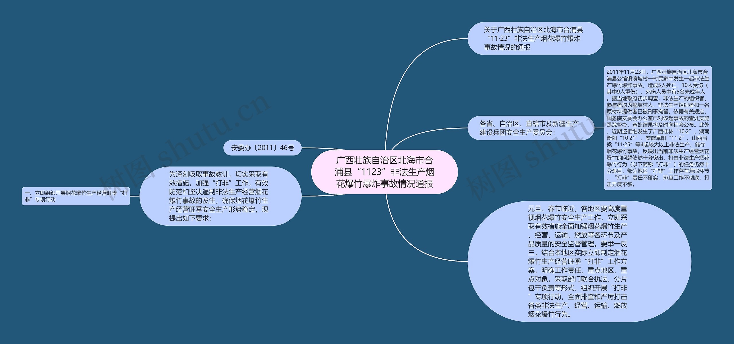 2011年11月23日,广西壮族自治区北海市合浦县公馆镇浪坡村一村民家中发生一起非法生产爆竹爆炸事故,造成5人死亡、10人受伤(其中9人重伤),死伤人员中有5名未成年人。据当地政府初步调查,非法生产的组织者、参与者均为浪坡村人,非法生产组织者和一名原材料提供者已被刑事拘留。依据有关规定,国务院安委会办公室已对该起事故的查处实施跟踪督办,查处结果将及时向社会公布。此外,近期还相继发生了广西桂林“10·2”、湖南衡阳“10·21”、安徽阜阳“11·2”、山西吕梁“11·25”等4起较大以上非法生产、储存烟花爆竹事故,反映出当前非法生产经营烟花爆竹的问题依然十分突出,打击非法生产烟花爆竹行为(以下简称“打非”)的任务仍然十分艰巨,部分地区“打非”工作存在薄弱环节,“打非”责任不落实,排查工作不彻底,打击力度不够。