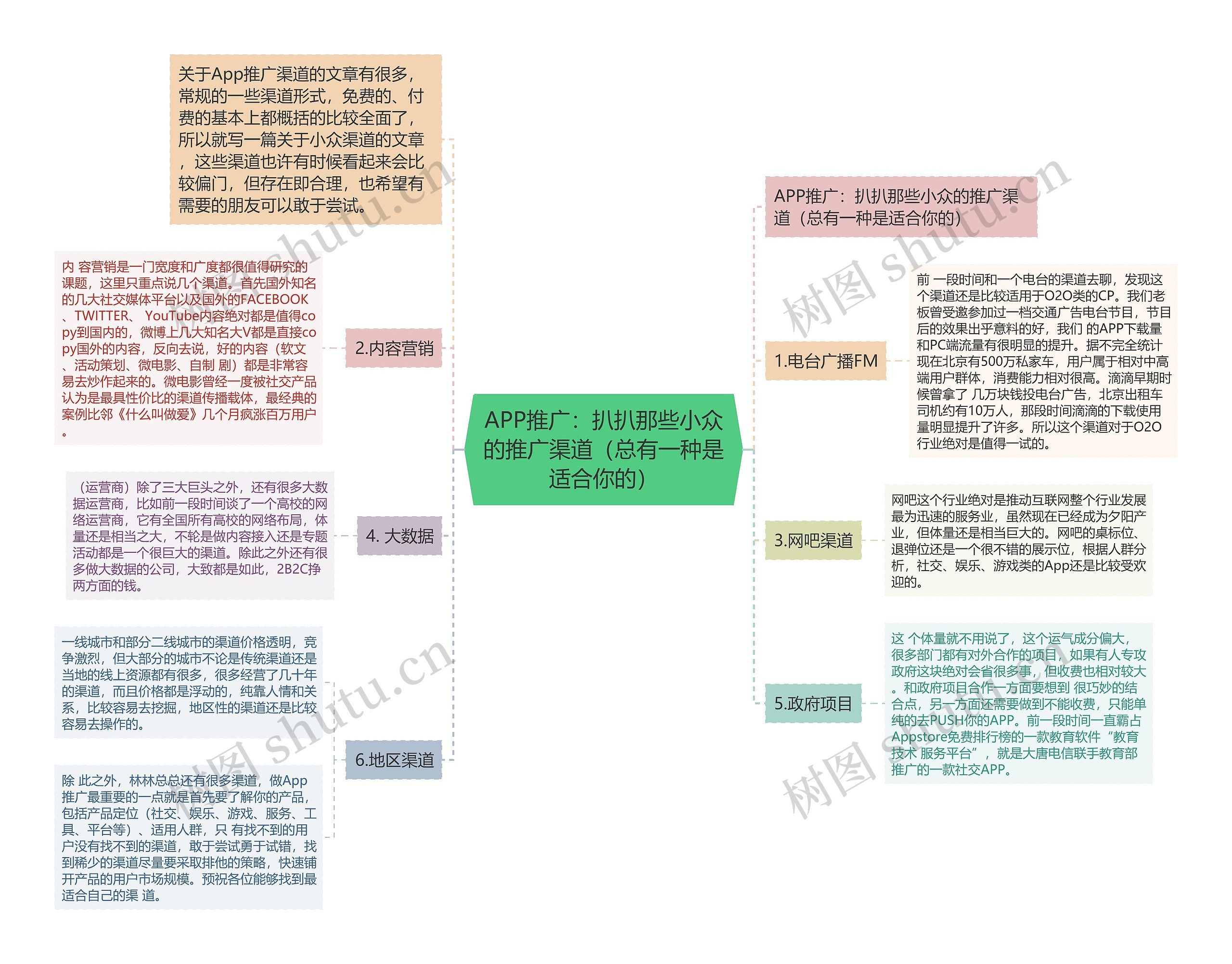 树图思维导图提供《APP推广:扒扒那些小众的推广渠道(总有一种是适合你的)》在线思维导图免费制作,点击“编辑”按钮,可对《APP推广:扒扒那些小众的推广渠道(总有一种是适合你的)》进行在线思维导图编辑,本思维导图属于思维导图模板主题,文件编号是:bd03287a3996acc49c6e243fd5fa9f32