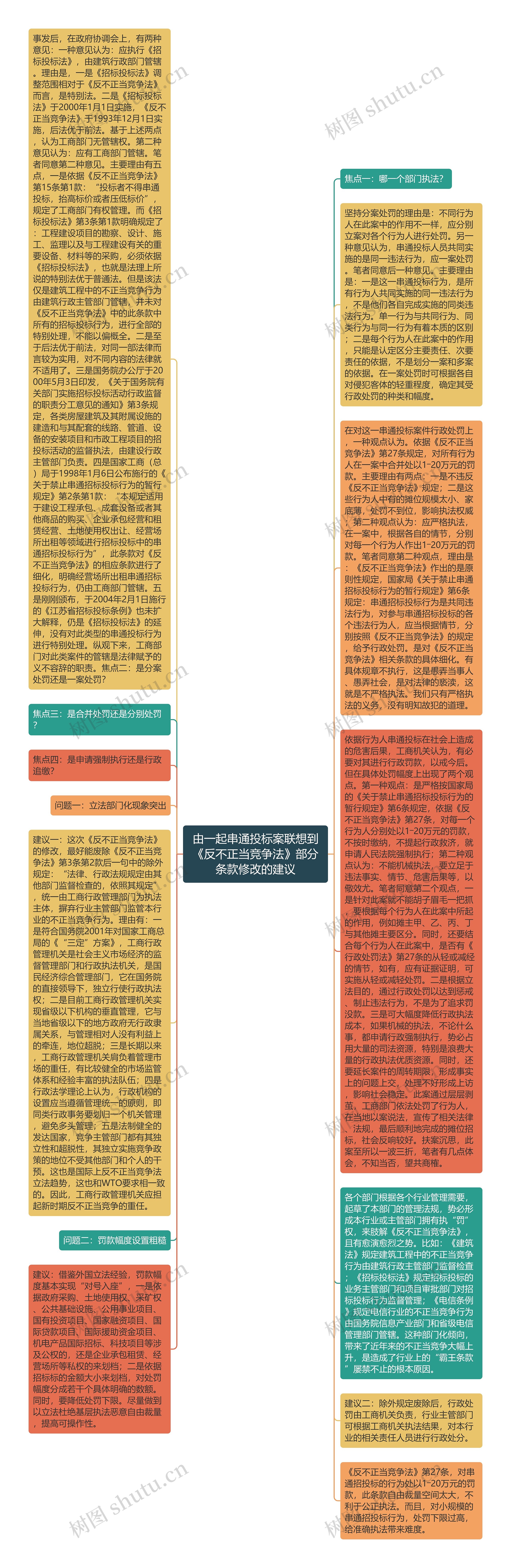 事发后,在政府协调会上,有两种意见:一种意见认为:应执行《招标投标法》,由建筑行政部门管辖。理由是,一是《招标投标法》调整范围相对于《反不正当竞争法》而言,是特别法。二是《招标投标法》于2000年1月1日实施,《反不正当竞争法》于1993年12月1日实施,后法优于前法。基于上述两点,认为工商部门无管辖权。第二种意见认为:应有工商部门管辖。笔者同意第二种意见。主要理由有五点,一是依据《反不正当竞争法》第15条第1款:“投标者不得串通投标,抬高标价或者压低标价”,规定了工商部门有权管理。而《招标投标法》第3条第1款明确规定了:工程建设项目的勘察、设计、施工、监理以及与工程建设有关的重要设备、材料等的采购,必须依据《招标投标法》,也就是法理上所说的特别法优于普通法。但是该法仅是建筑工程中的不正当竞争行为由建筑行政主管部门管辖,并未对《反不正当竞争法》中的此条款中所有的招标投标行为,进行全部的特别处理,不能以偏概全。二是至于后法优于前法,对同一部法律而言较为实用,对不同内容的法律就不适用了。三是国务院办公厅于2000年5月3日印发,《关于国务院有关部门实施招标投标活动行政监督的职责分工意见的通知》第3条规定,各类房屋建筑及其附属设施的建造和与其配套的线路、管道、设备的安装项目和市政工程项目的招投标活动的监督执法,由建设行政主管部门负责。四是国家工商(总)局于1998年1月6日公布施行的《关于禁止串通招标投标行为的暂行规定》第2条第1款:“本规定适用于建设工程承包、成套设备或者其他商品的购买、企业承包经营和租赁经营、土地使用权出让、经营场所出租等领域进行招标投标中的串通招标投标行为”,此条款对《反不正当竞争法》的相应条款进行了细化,明确经营场所出租串通招标投标行为,仍由工商部门管辖。五是刚刚颁布,于2004年2月1日施行的《江苏省招标投标条例》也未扩大解释,仍是《招标投标法》的延伸,没有对此类型的串通投标行为进行特别处理。纵观下来,工商部门对此类案件的管辖是法律赋予的义不容辞的职责。焦点二:是分案处罚还是一案处罚?