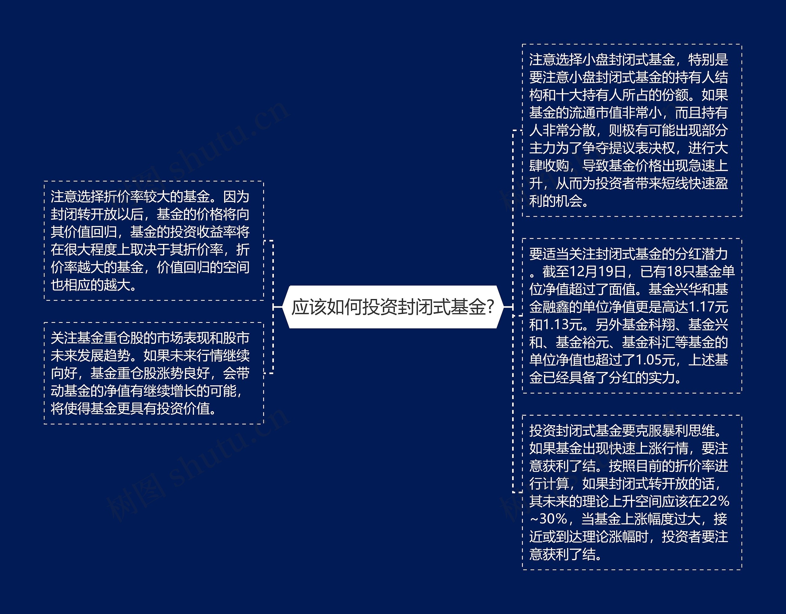 投资封闭式基金要克服暴利思维。如果基金出现快速上涨行情,要注意获利了结。按照目前的折价率进行计算,如果封闭式转开放的话,其未来的理论上升空间应该在22%~30%,当基金上涨幅度过大,接近或到达理论涨幅时,投资者要注意获利了结。