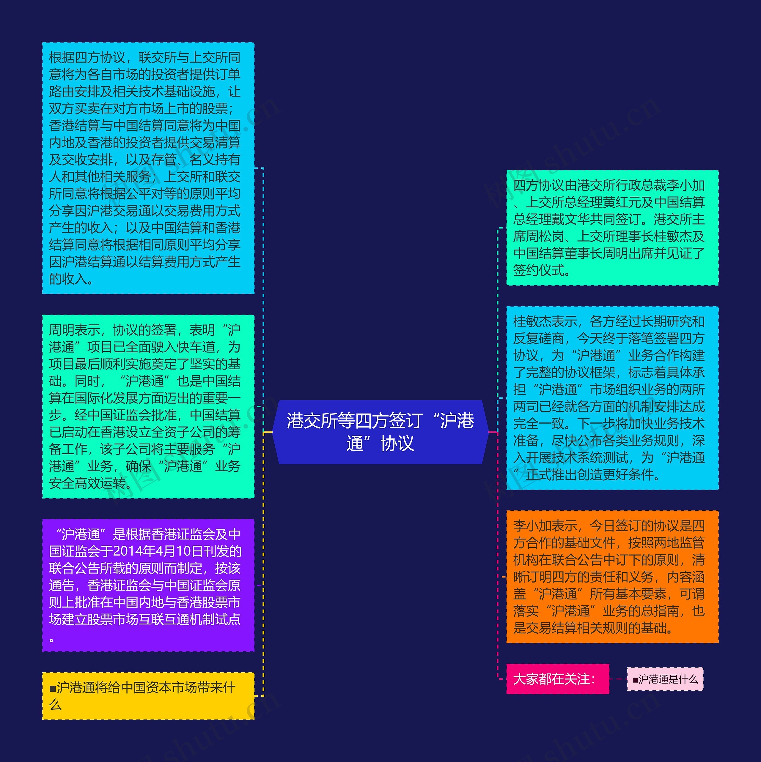 根据四方协议,联交所与上交所同意将为各自市场的投资者提供订单路由安排及相关技术基础设施,让双方买卖在对方市场上市的股票;香港结算与中国结算同意将为中国内地及香港的投资者提供交易清算及交收安排,以及存管、名义持有人和其他相关服务;上交所和联交所同意将根据公平对等的原则平均分享因沪港交易通以交易费用方式产生的收入;以及中国结算和香港结算同意将根据相同原则平均分享因沪港结算通以结算费用方式产生的收入。