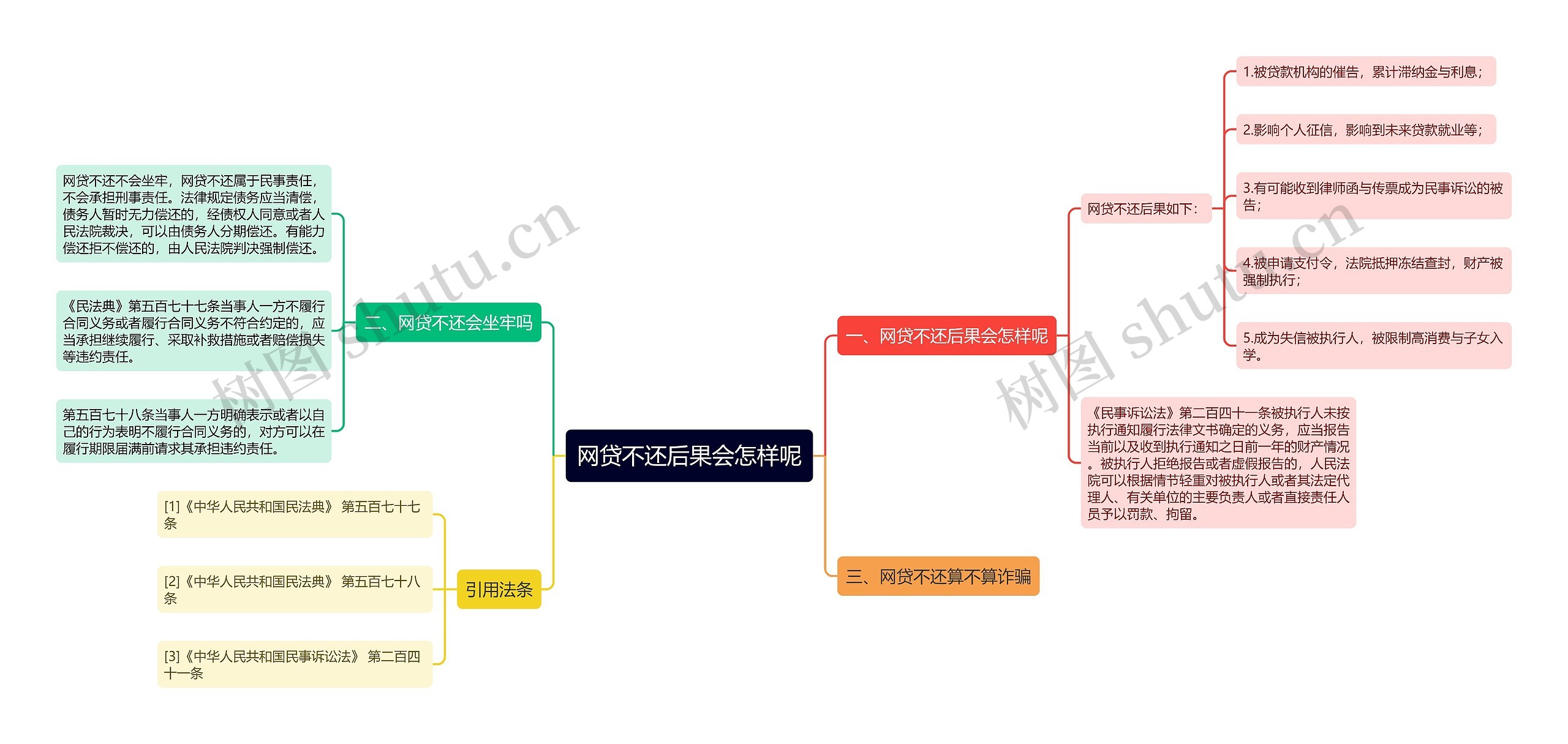 树图思维导图提供《网贷不还后果会怎样呢》在线思维导图免费制作,点击“编辑”按钮,可对《网贷不还后果会怎样呢》进行在线思维导图编辑,本思维导图属于思维导图模板主题,文件编号是:aca128905302ef0cdd26c1d7871b2449