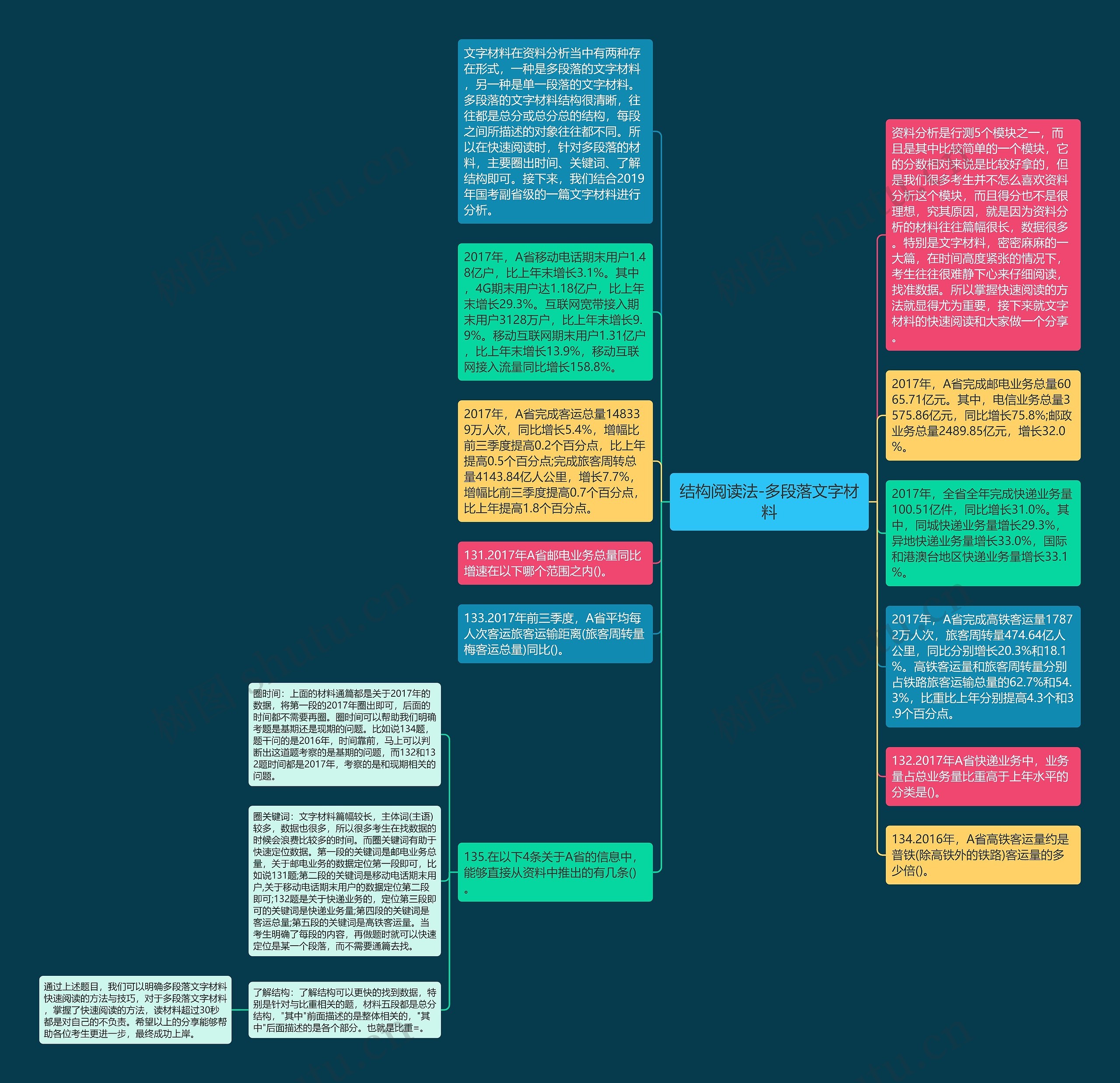 圈关键词:文字材料篇幅较长,主体词(主语)较多,数据也很多,所以很多考生在找数据的时候会浪费比较多的时间。而圈关键词有助于快速定位数据。第一段的关键词是邮电业务总量,关于邮电业务的数据定位第一段即可,比如说131题;第二段的关键词是移动电话期末用户,关于移动电话期末用户的数据定位第二段即可;132题是关于快递业务的,定位第三段即可的关键词是快递业务量;第四段的关键词是客运总量;第五段的关键词是高铁客运量。当考生明确了每段的内容,再做题时就可以快速定位是某一个段落,而不需要通篇去找。