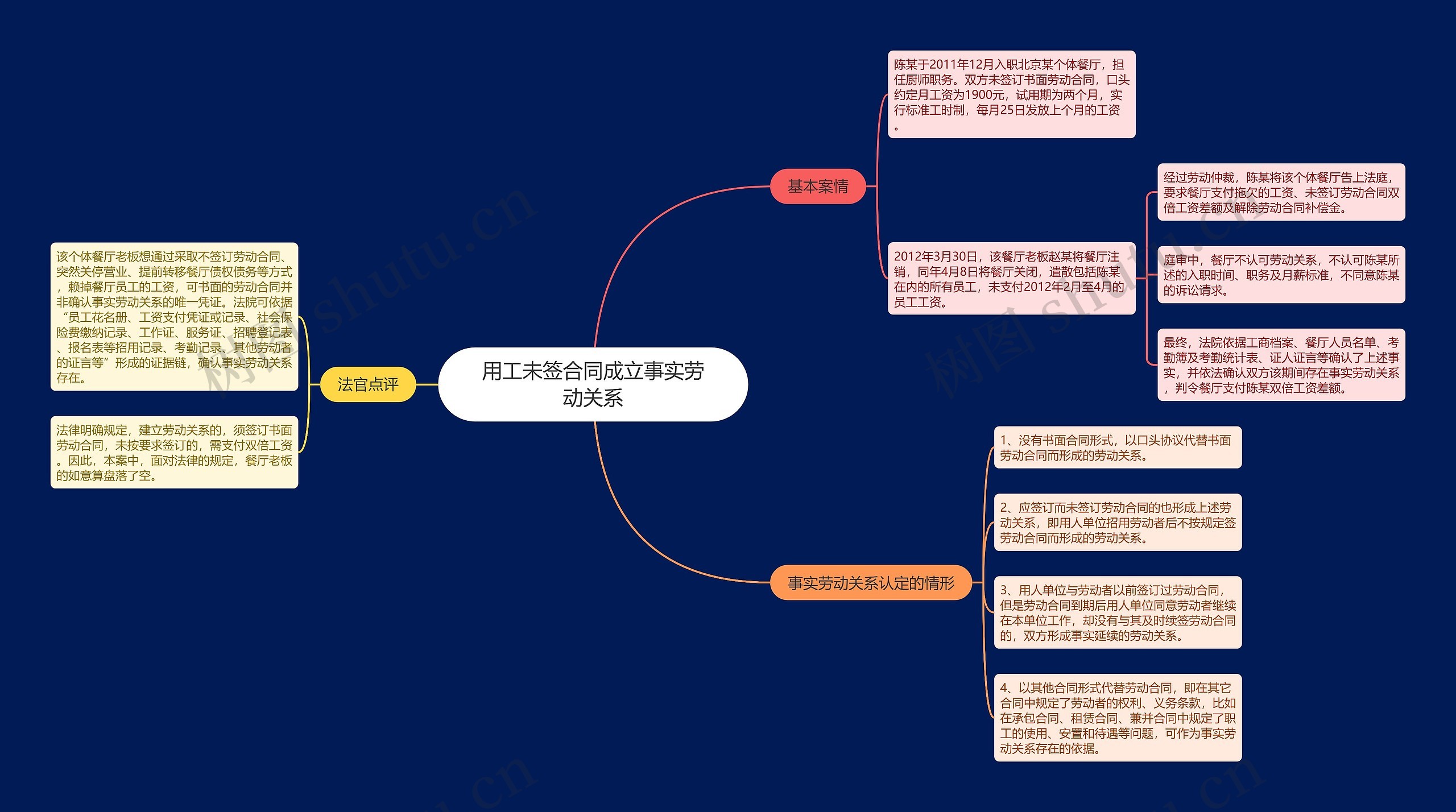 树图思维导图提供《用工未签合同成立事实劳动关系》在线思维导图免费制作,点击“编辑”按钮,可对《用工未签合同成立事实劳动关系》进行在线思维导图编辑,本思维导图属于思维导图模板主题,文件编号是:c4bf9e95a2ef35e043e50340701608fd