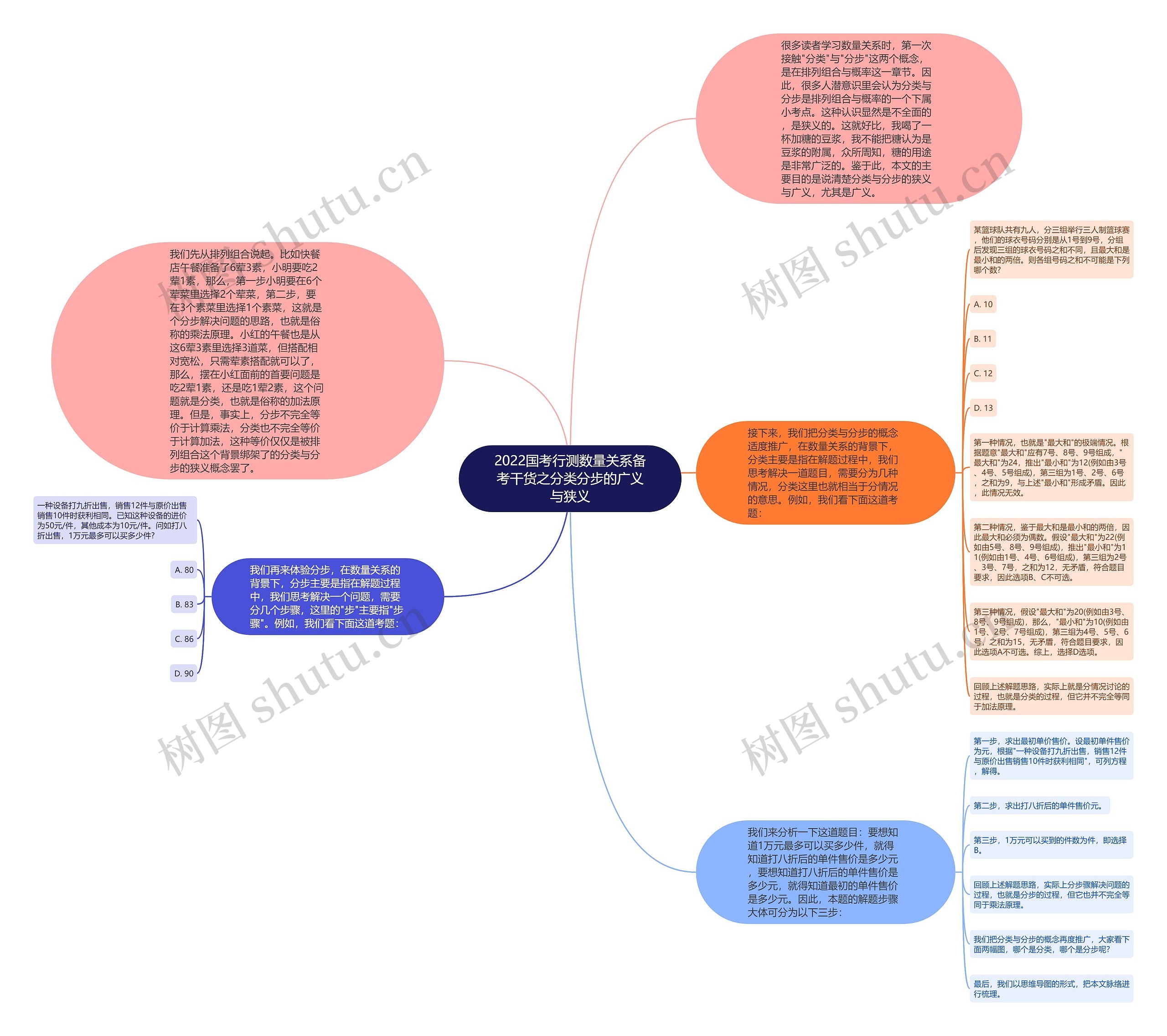 接下来,我们把分类与分步的概念适度推广,在数量关系的背景下,分类主要是指在解题过程中,我们思考解决一道题目,需要分为几种情况,分类这里也就相当于分情况的意思。例如,我们看下面这道考题: