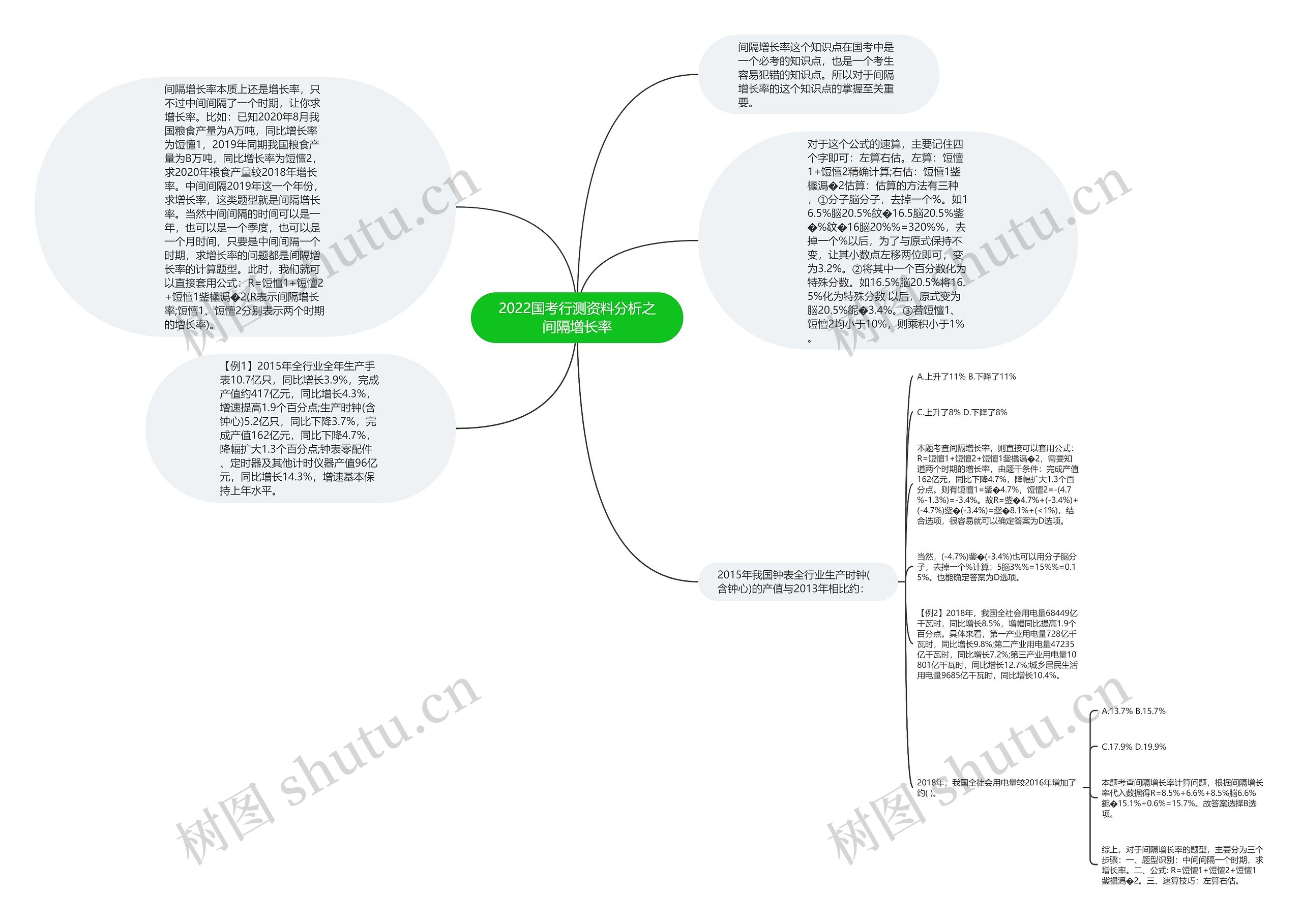 综上,对于间隔增长率的题型,主要分为三个步骤:一、题型识别:中间间隔一个时期,求增长率。二、公式: R=饾憻1+饾憻2+饾憻1鈭欚潙�2。三、速算技巧:左算右估。