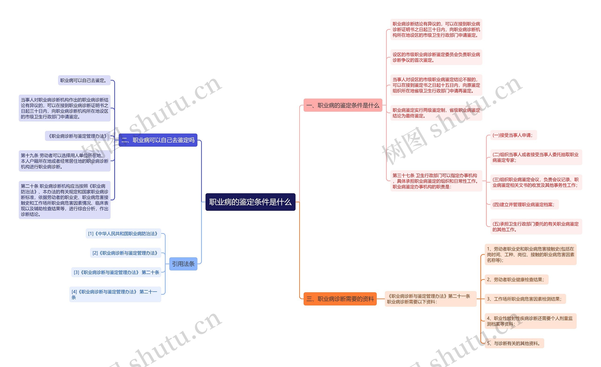 树图思维导图提供《职业病的鉴定条件是什么》在线思维导图免费制作,点击“编辑”按钮,可对《职业病的鉴定条件是什么》进行在线思维导图编辑,本思维导图属于思维导图模板主题,文件编号是:8871a205d44a3ec95a81e9f0d55b5687