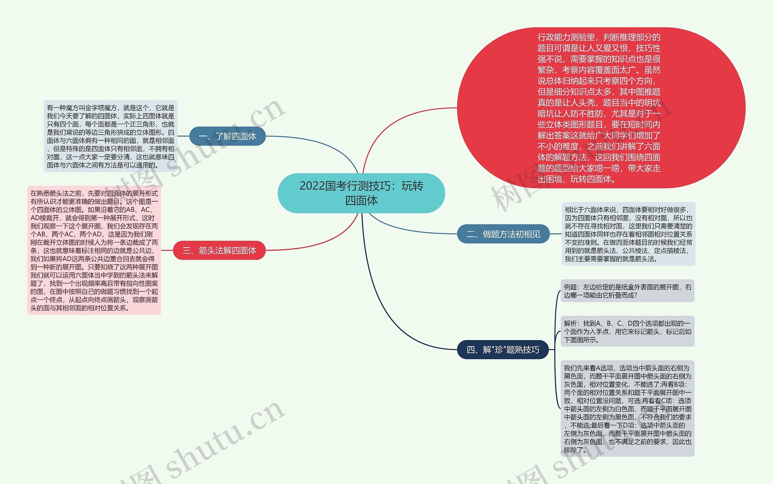树图思维导图提供《2022国考行测技巧:玩转四面体》在线思维导图免费制作,点击“编辑”按钮,可对《2022国考行测技巧:玩转四面体》进行在线思维导图编辑,本思维导图属于思维导图模板主题,文件编号是:5ad80c2f52c1744f741ae88965fb9933