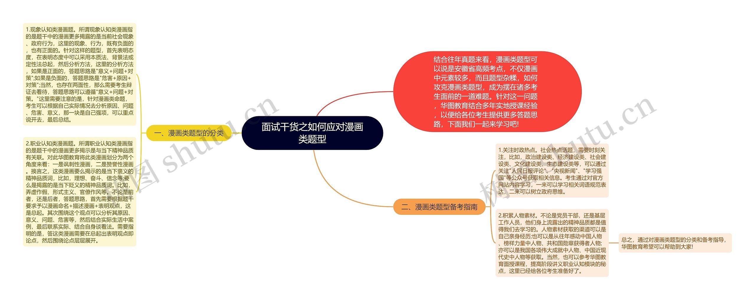 树图思维导图提供《面试干货之如何应对漫画类题型》在线思维导图免费制作,点击“编辑”按钮,可对《面试干货之如何应对漫画类题型》进行在线思维导图编辑,本思维导图属于思维导图模板主题,文件编号是:f46e0e46dafa7ffe2a179d6a8e23a188