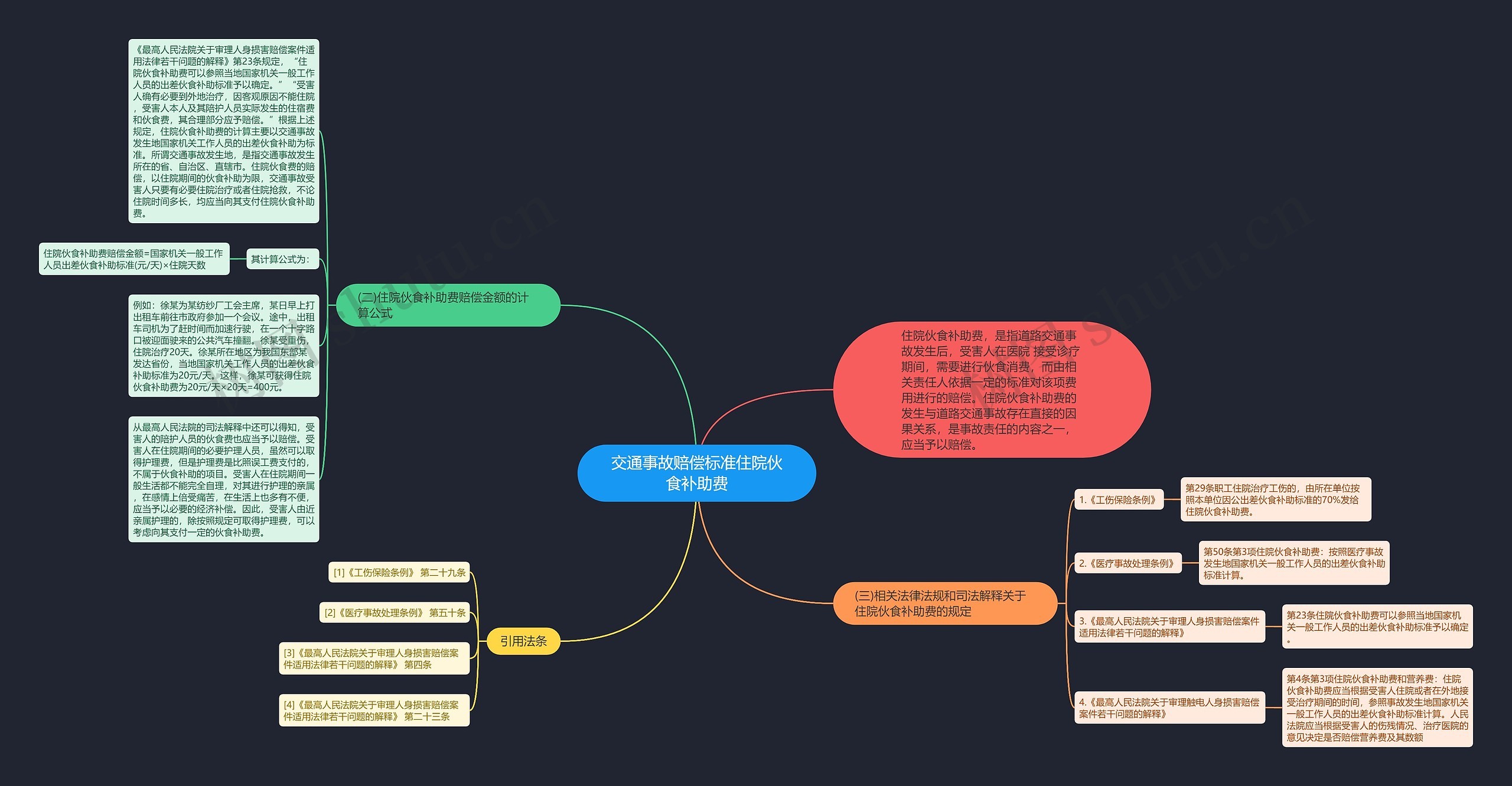 《最高人民法院关于审理人身损害赔偿案件适用法律若干问题的解释》第23条规定,“住院伙食补助费可以参照当地国家机关一般工作人员的出差伙食补助标准予以确定。”“受害人确有必要到外地治疗,因客观原因不能住院,受害人本人及其陪护人员实际发生的住宿费和伙食费,其合理部分应予赔偿。”根据上述规定,住院伙食补助费的计算主要以交通事故发生地国家机关工作人员的出差伙食补助为标准。所谓交通事故发生地,是指交通事故发生所在的省、自治区、直辖市。住院伙食费的赔偿,以住院期间的伙食补助为限,交通事故受害人只要有必要住院治疗或者住院抢救,不论住院时间多长,均应当向其支付住院伙食补助费。