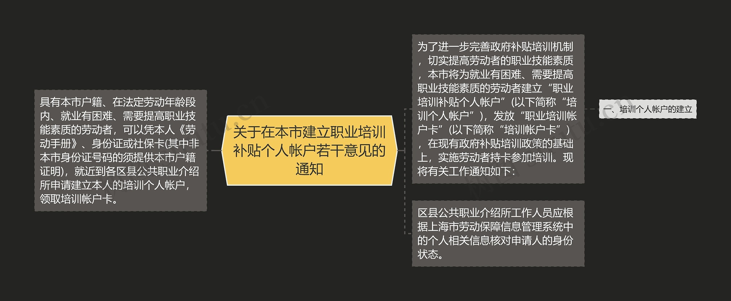 树图思维导图提供《关于在本市建立职业培训补贴个人帐户若干意见的通知》在线思维导图免费制作,点击“编辑”按钮,可对《关于在本市建立职业培训补贴个人帐户若干意见的通知》进行在线思维导图编辑,本思维导图属于思维导图模板主题,文件编号是:8613afcc00e53d7183c2afb9bcd8b7e5