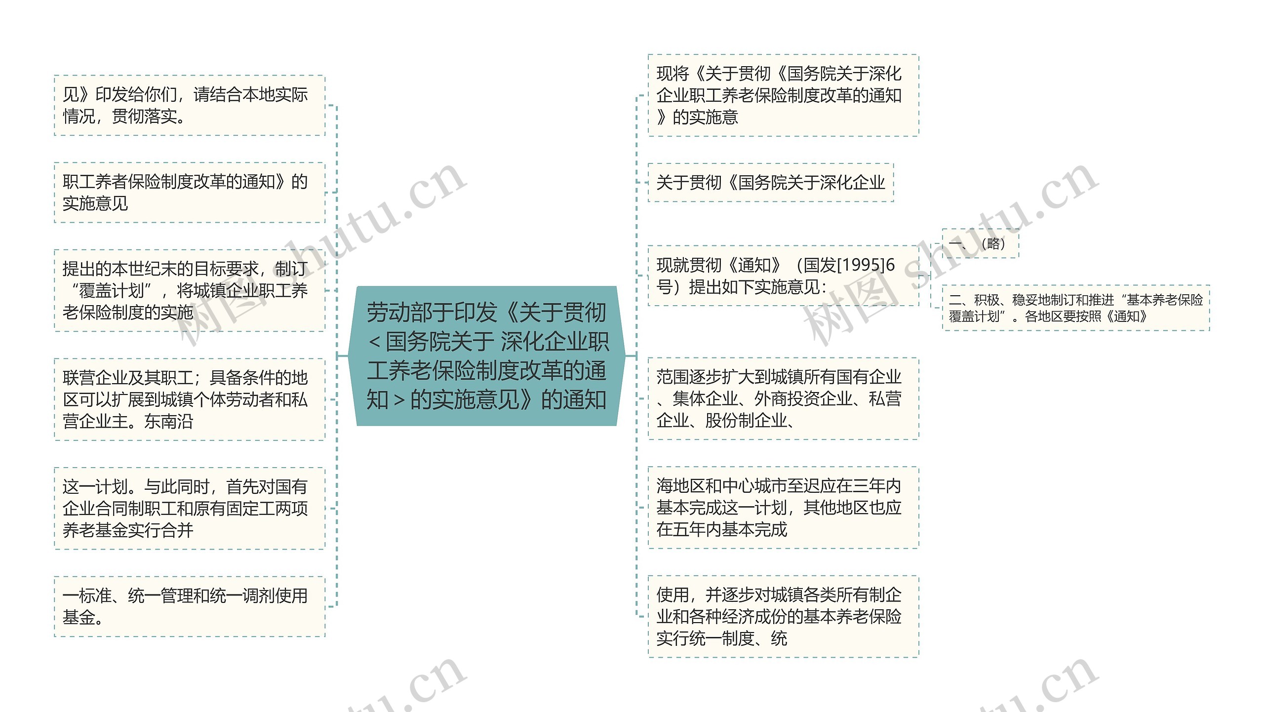 树图思维导图提供《劳动部于印发《关于贯彻<国务院关于 深化企业职工养老保险制度改革的通知>的实施意见》的通知》在线思维导图免费制作,点击“编辑”按钮,可对《劳动部于印发《关于贯彻<国务院关于 深化企业职工养老保险制度改革的通知>的实施意见》的通知》进行在线思维导图编辑,本思维导图属于思维导图模板主题,文件编号是:98d0e8898caf104c242c4aaa9749c978