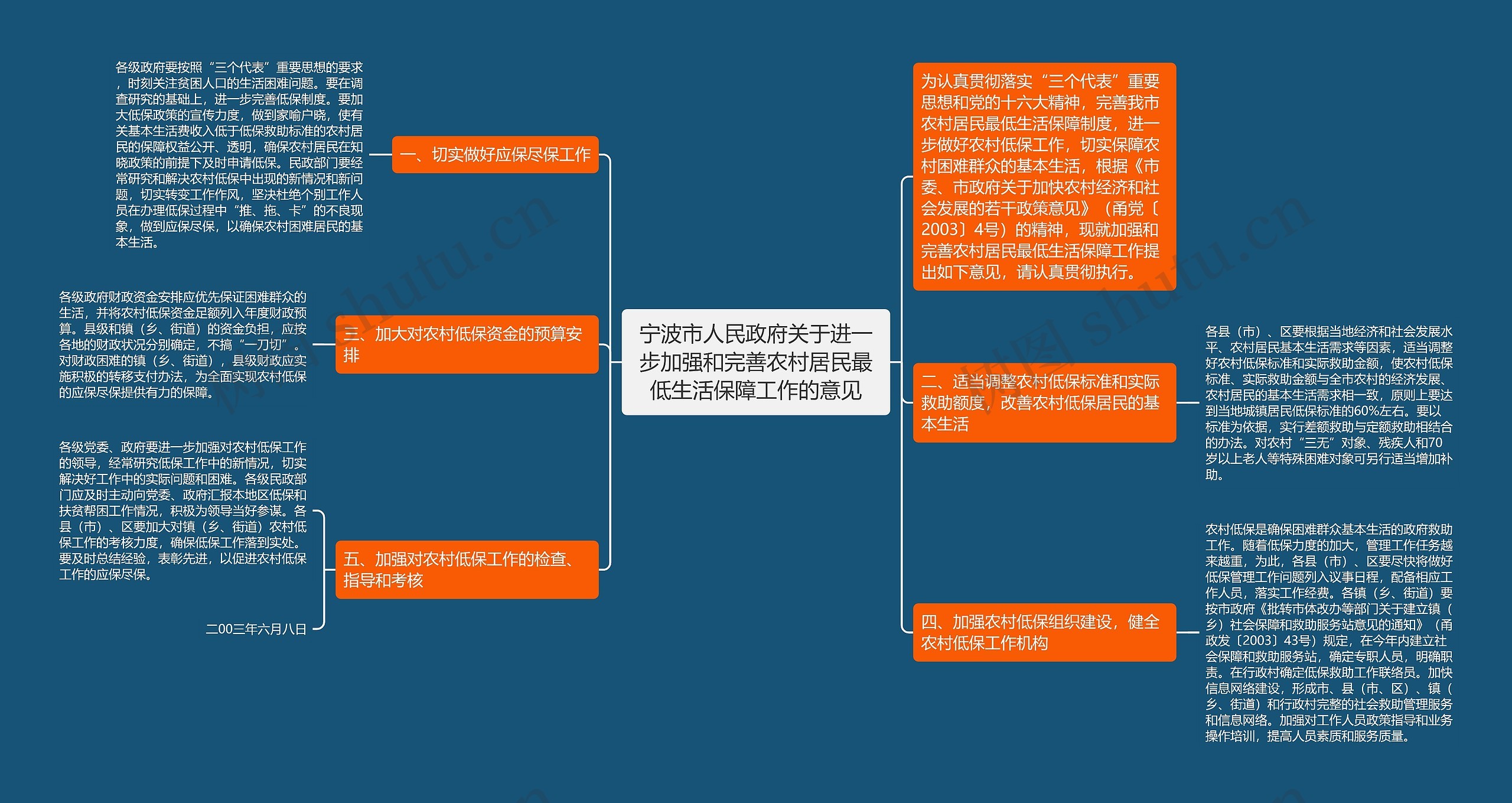 树图思维导图提供《宁波市人民政府关于进一步加强和完善农村居民最低生活保障工作的意见》在线思维导图免费制作,点击“编辑”按钮,可对《宁波市人民政府关于进一步加强和完善农村居民最低生活保障工作的意见》进行在线思维导图编辑,本思维导图属于思维导图模板主题,文件编号是:2d1909ace03c3bbdbbc7708a3c57b7e3