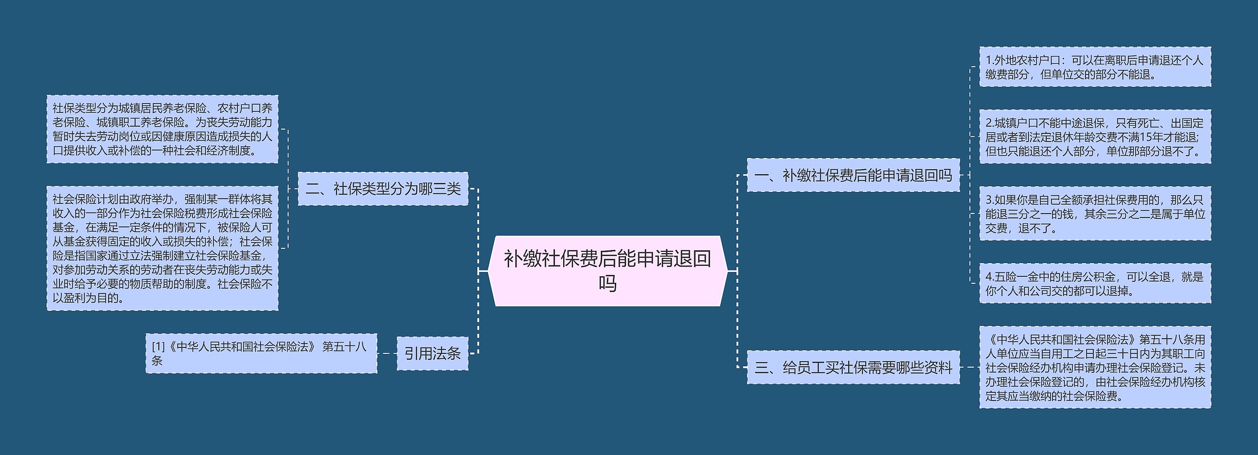 树图思维导图提供《补缴社保费后能申请退回吗》在线思维导图免费制作,点击“编辑”按钮,可对《补缴社保费后能申请退回吗》进行在线思维导图编辑,本思维导图属于思维导图模板主题,文件编号是:0eb3e508f9641f4c312a2065be79eedd