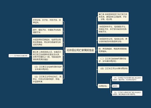 工伤处理条例第一条 为明确因工死亡职工供养亲属范围,根据《工伤保险条例》第三十七条第一款第二项的授权,制定本规定。 第二条 本规定所称因工死亡职工供养亲属,是指该职工的配偶、子女、父母、祖父母、外祖父母、孙子女、外孙子女、兄弟姐妹。本规定所称子女,包括婚生子女、非婚生子女、养子女和有抚养关系的继子女,其中,婚生子女、非婚生子女包括遗腹子女;本规定所称父母,包括生父母、养父母和有抚养关系的继父母;本规定所称兄弟姐妹,包括同父母的兄弟姐妹、同父异母或者同母异父的兄弟姐妹、养兄弟姐妹、有抚养关系的继兄弟姐妹。 第三条 上条规定的人员,依靠因工死亡职工生前提供主要生活来源,并有下列情形之一的,可按规定申请供养亲属抚恤金:(一)完全丧失劳动能力的;(二)工亡职工配偶男年满6O周岁、女年满55周岁的;(三)工亡职工父母男年满60周岁、女年满55周岁的;(四)工亡职工子女未满18周岁的;(五)工亡职工父母均已死亡,其祖父、外祖父年满60周岁,祖母、外祖母年满55周岁的;(六)工亡职工子女已经死亡或完全丧失劳动能力,其孙子女、外孙子女未满18周岁的;(七)工亡职工父母均已死亡或完全丧失劳动能力,其兄弟姐妹未满18周岁的。 第四条 领取抚恤金人员有下列情形之一的,停止享受抚恤金待遇:(一)年满18周岁且未完全丧失劳动能力的;(二)就业或参军的;(三)工亡职工配偶再婚的;(四)被他人或组织收养的;(五)死亡的。 第五条 领取抚恤金的人员,在被判刑收监执行期间,停止享受抚恤金待遇。刑满释放仍符合领取抚恤金资格的,按规定的标准享受抚恤金。