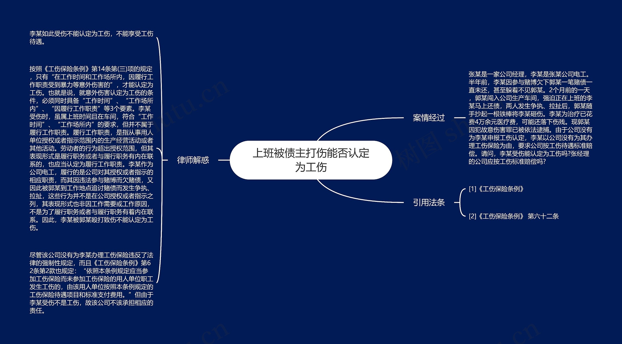 树图思维导图提供《上班被债主打伤能否认定为工伤》在线思维导图免费制作,点击“编辑”按钮,可对《上班被债主打伤能否认定为工伤》进行在线思维导图编辑,本思维导图属于思维导图模板主题,文件编号是:83350938ca1f0d772abb31a6798e9bdd