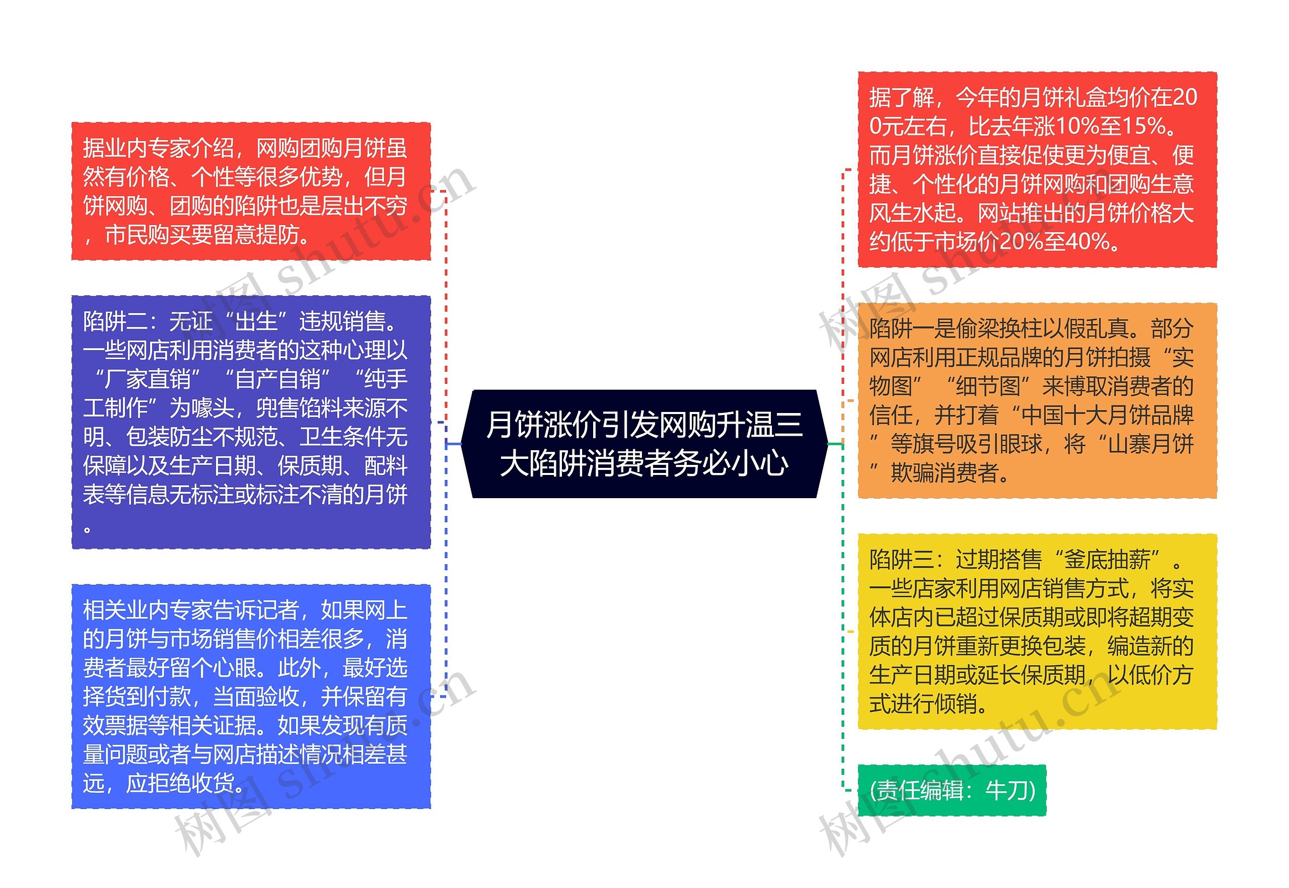树图思维导图提供《月饼涨价引发网购升温三大陷阱消费者务必小心》在线思维导图免费制作,点击“编辑”按钮,可对《月饼涨价引发网购升温三大陷阱消费者务必小心》进行在线思维导图编辑,本思维导图属于思维导图模板主题,文件编号是:d2a7a512c899a5dd5b38f050b558b0f9