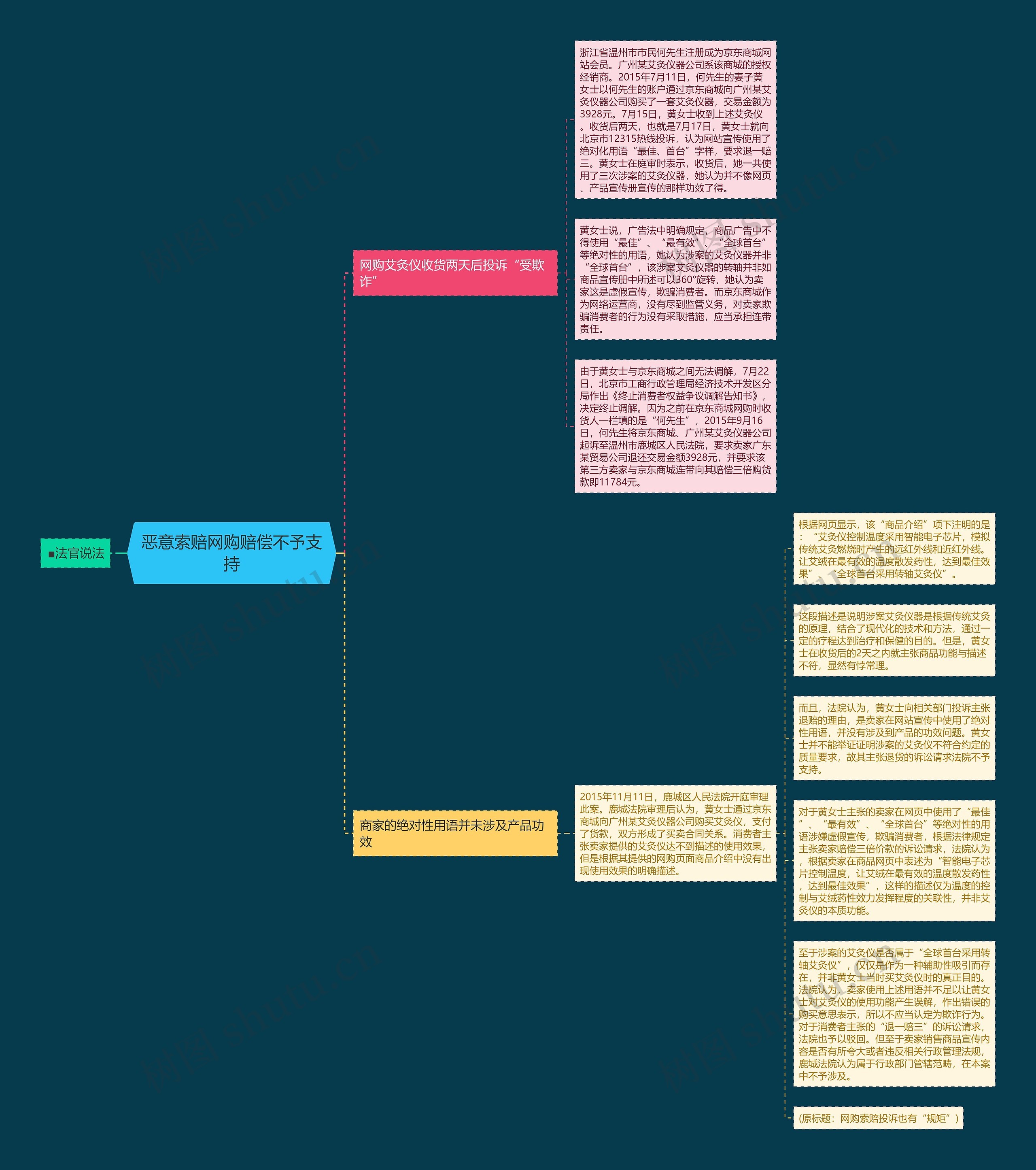 而且,法院认为,黄女士向相关部门投诉主张退赔的理由,是卖家在网站宣传中使用了绝对性用语,并没有涉及到产品的功效问题。黄女士并不能举证证明涉案的艾灸仪不符合约定的质量要求,故其主张退货的诉讼请求法院不予支持。