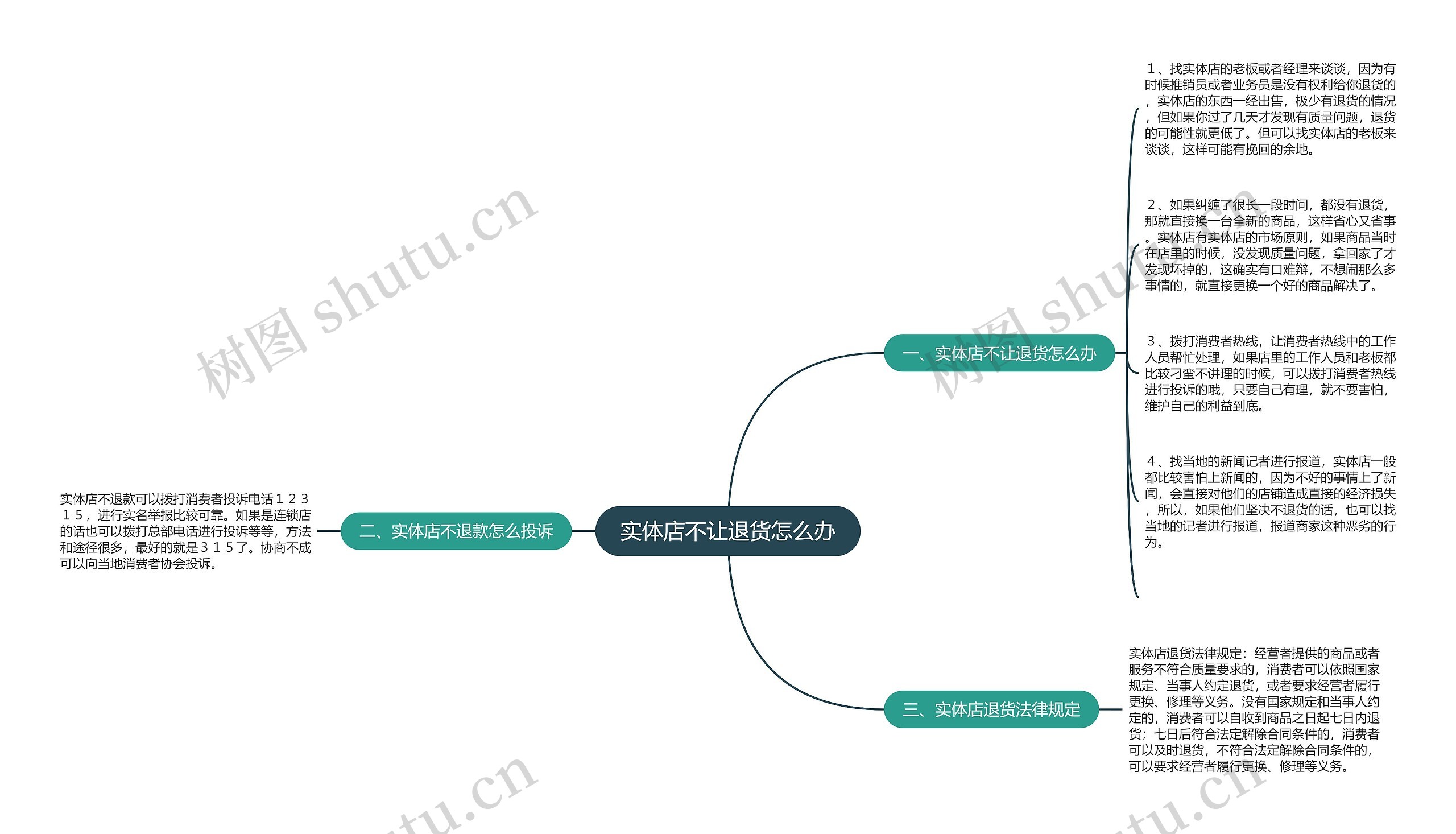 树图思维导图提供《实体店不让退货怎么办》在线思维导图免费制作,点击“编辑”按钮,可对《实体店不让退货怎么办》进行在线思维导图编辑,本思维导图属于思维导图模板主题,文件编号是:b4f9250abb22d7f922e7e33ce828cc3a