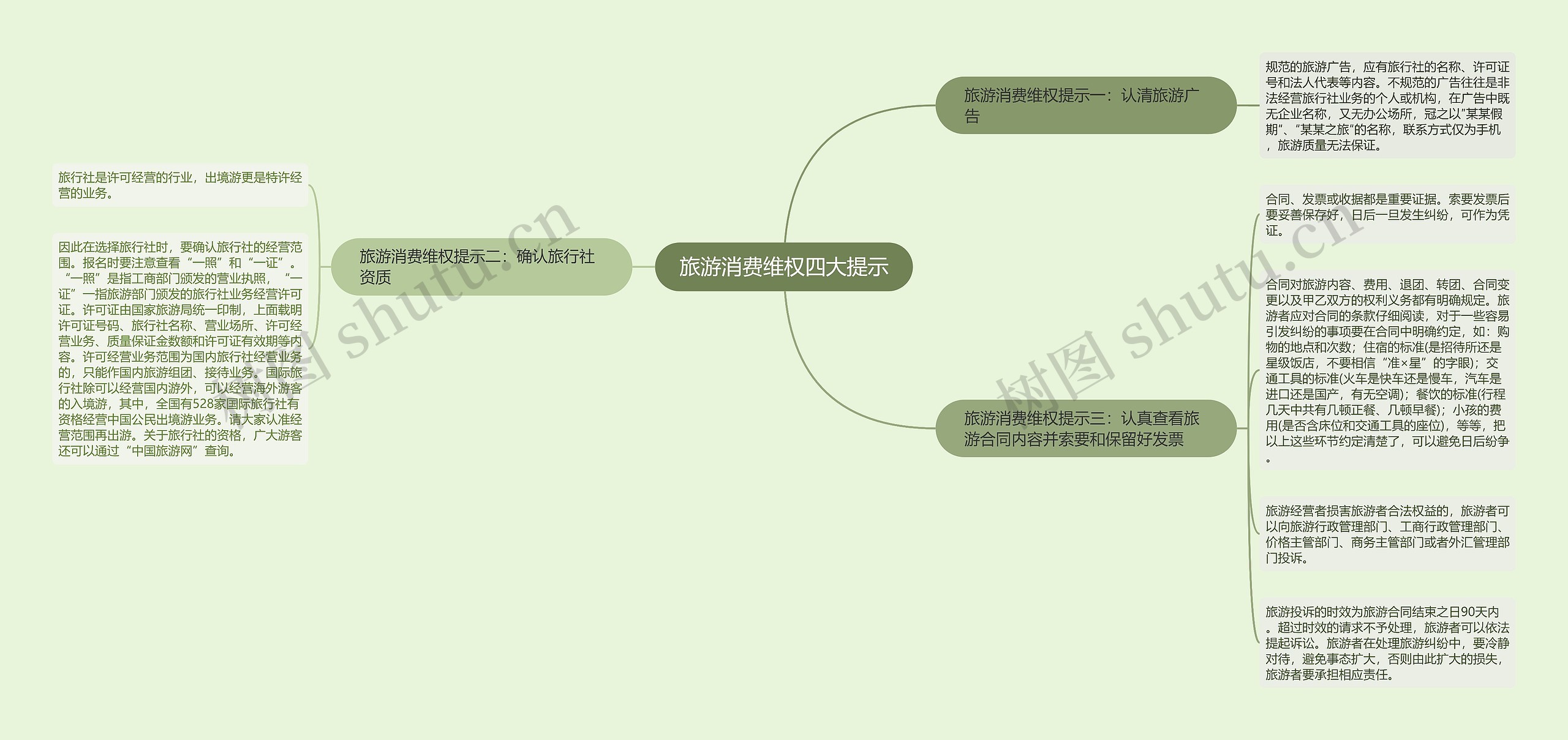 树图思维导图提供《旅游消费维权四大提示》在线思维导图免费制作,点击“编辑”按钮,可对《旅游消费维权四大提示》进行在线思维导图编辑,本思维导图属于思维导图模板主题,文件编号是:891da34c341a5044203f6c7a4685f0bf