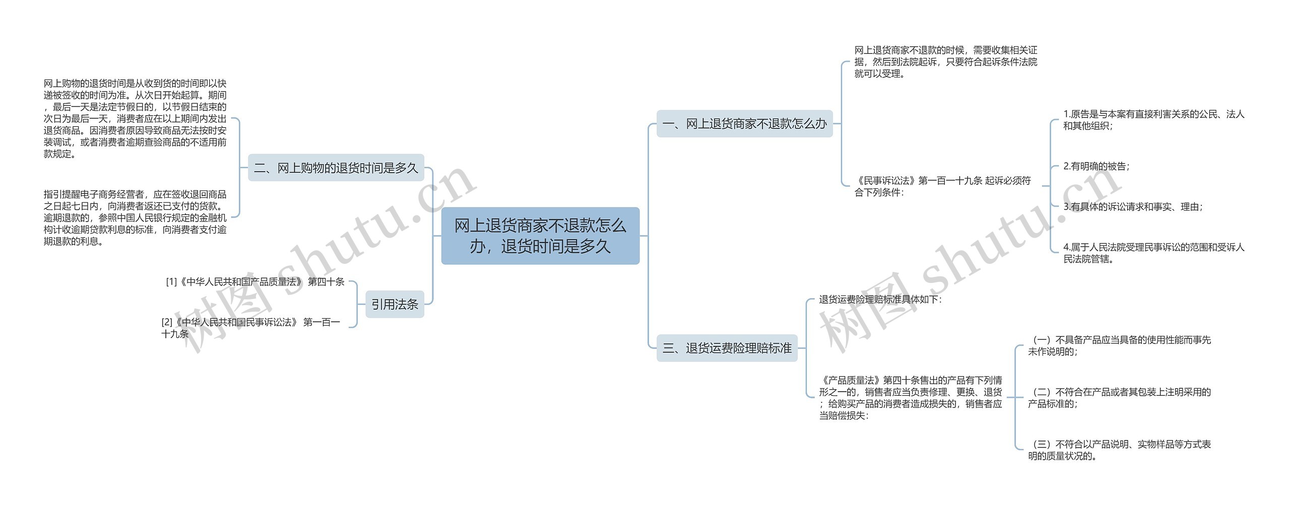 树图思维导图提供《网上退货商家不退款怎么办,退货时间是多久》在线思维导图免费制作,点击“编辑”按钮,可对《网上退货商家不退款怎么办,退货时间是多久》进行在线思维导图编辑,本思维导图属于思维导图模板主题,文件编号是:f4181f80c28b980e76e2684720c9bf11