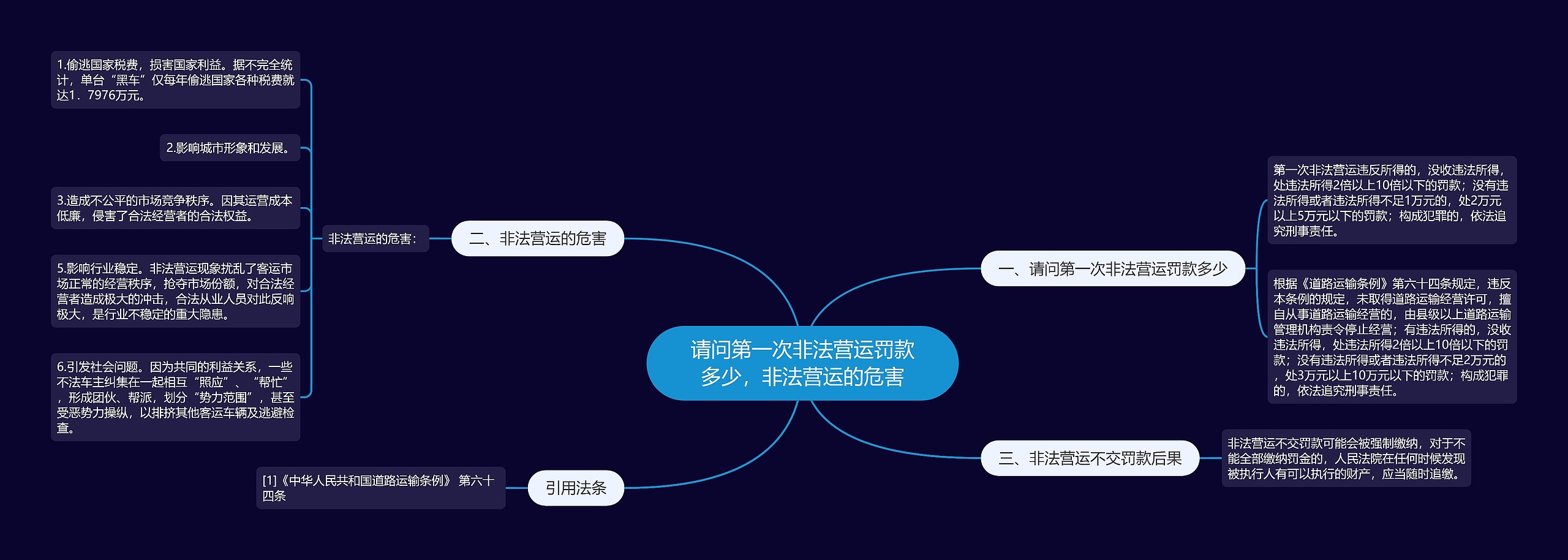 树图思维导图提供《请问第一次非法营运罚款多少,非法营运的危害》在线思维导图免费制作,点击“编辑”按钮,可对《请问第一次非法营运罚款多少,非法营运的危害》进行在线思维导图编辑,本思维导图属于思维导图模板主题,文件编号是:a290ab353fb7d0dcafbcb917b3844b89
