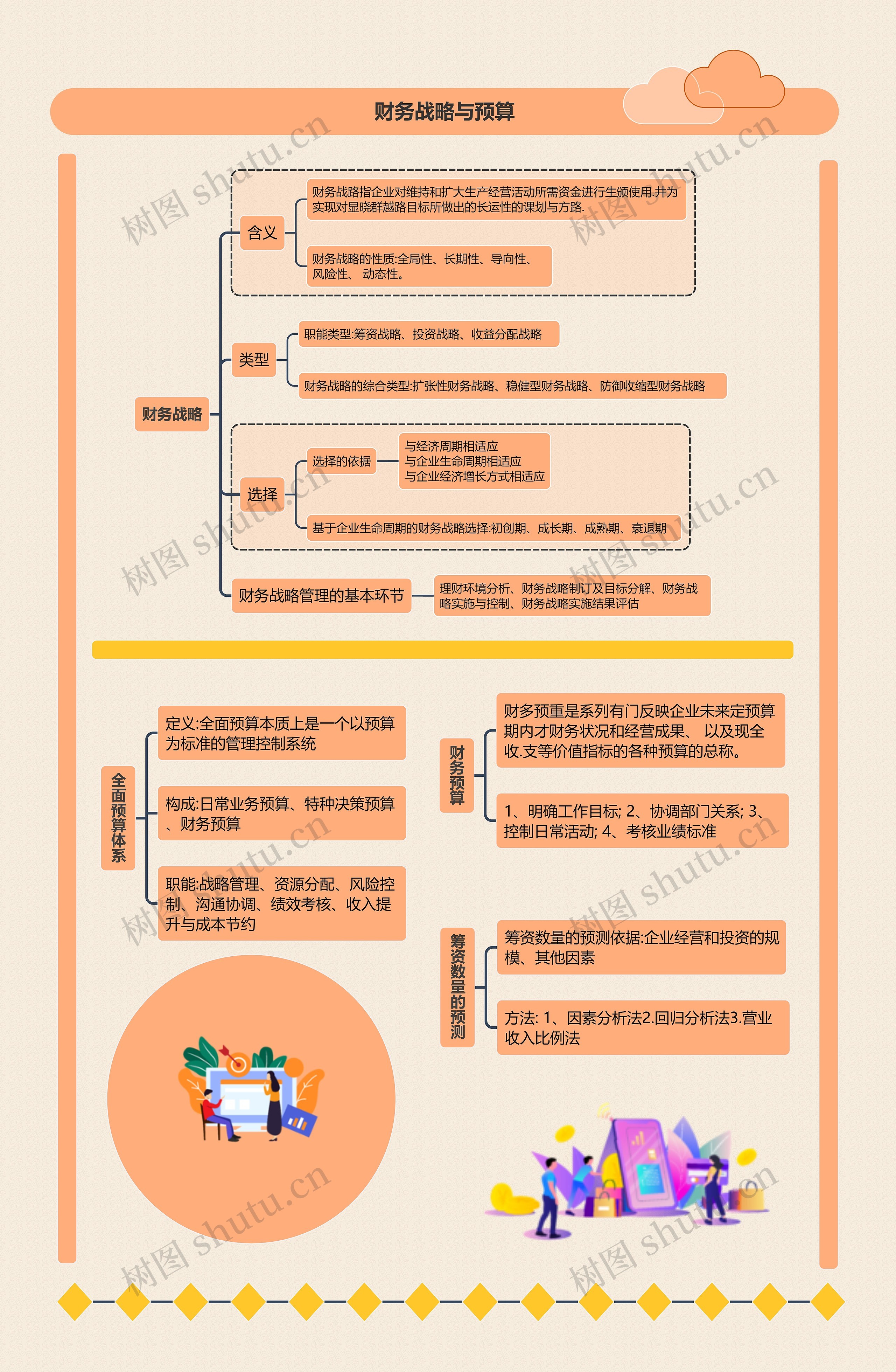 这是一篇商务思维导图,介绍了财务战略与预算相关知识