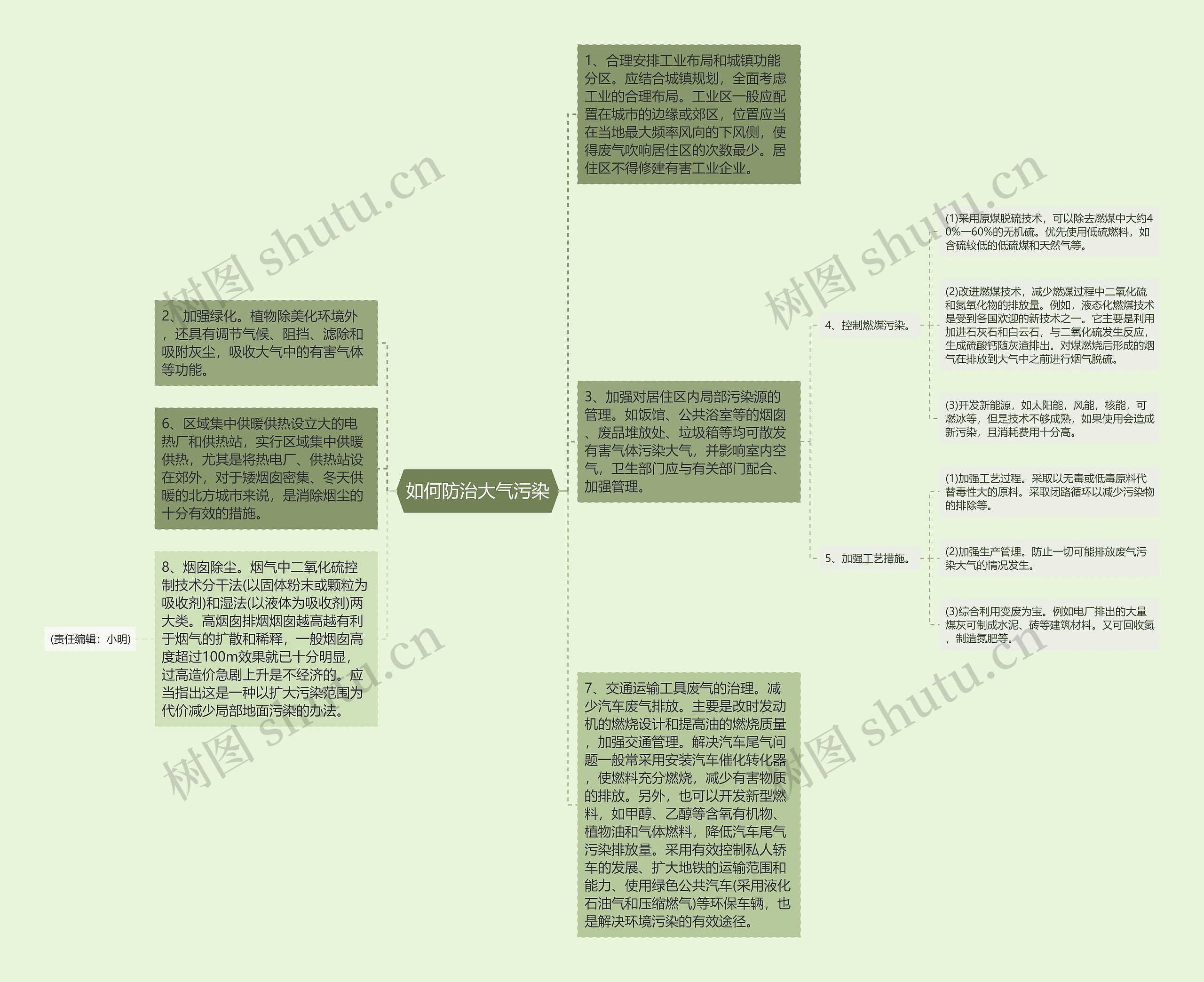 7、交通运输工具废气的治理。减少汽车废气排放。主要是改时发动机的燃烧设计和提高油的燃烧质量,加强交通管理。解决汽车尾气问题一般常采用安装汽车催化转化器,使燃料充分燃烧,减少有害物质的排放。另外,也可以开发新型燃料,如甲醇、乙醇等含氧有机物、植物油和气体燃料,降低汽车尾气污染排放量。采用有效控制私人轿车的发展、扩大地铁的运输范围和能力、使用绿色公共汽车(采用液化石油气和压缩燃气)等环保车辆,也是解决环境污染的有效途径。