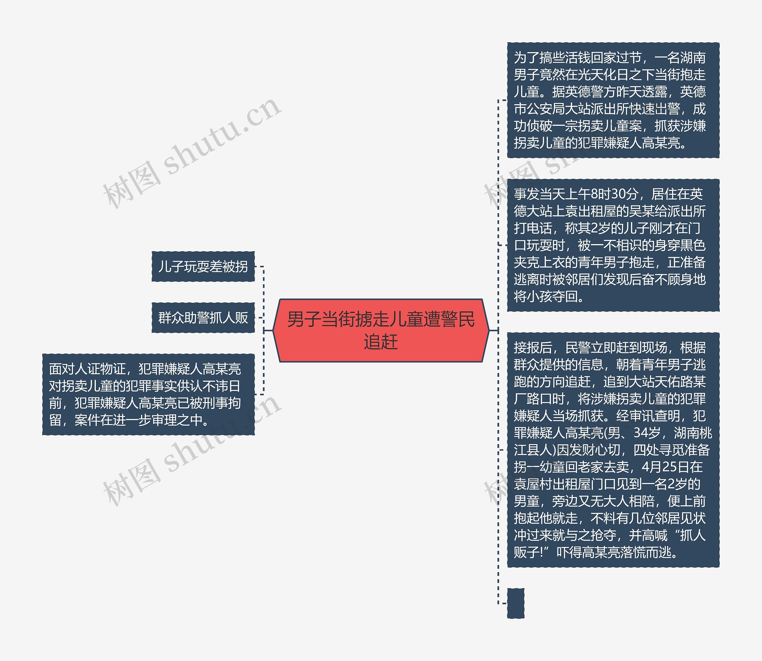 事发当天上午8时30分,居住在英德大站上袁出租屋的吴某给派出所打电话,称其2岁的儿子刚才在门口玩耍时,被一不相识的身穿黒色夹克上衣的青年男子抱走,正准备逃离时被邻居们发现后奋不顾身地将小孩夺回。