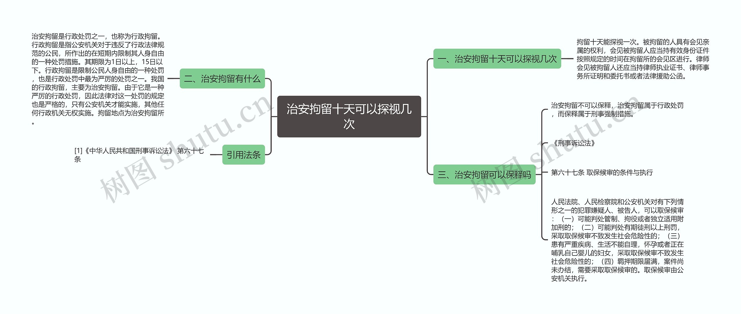树图思维导图提供《治安拘留十天可以探视几次》在线思维导图免费制作,点击“编辑”按钮,可对《治安拘留十天可以探视几次》进行在线思维导图编辑,本思维导图属于思维导图模板主题,文件编号是:b3cf3cd3938e4c5a2f78732ce553ccaf