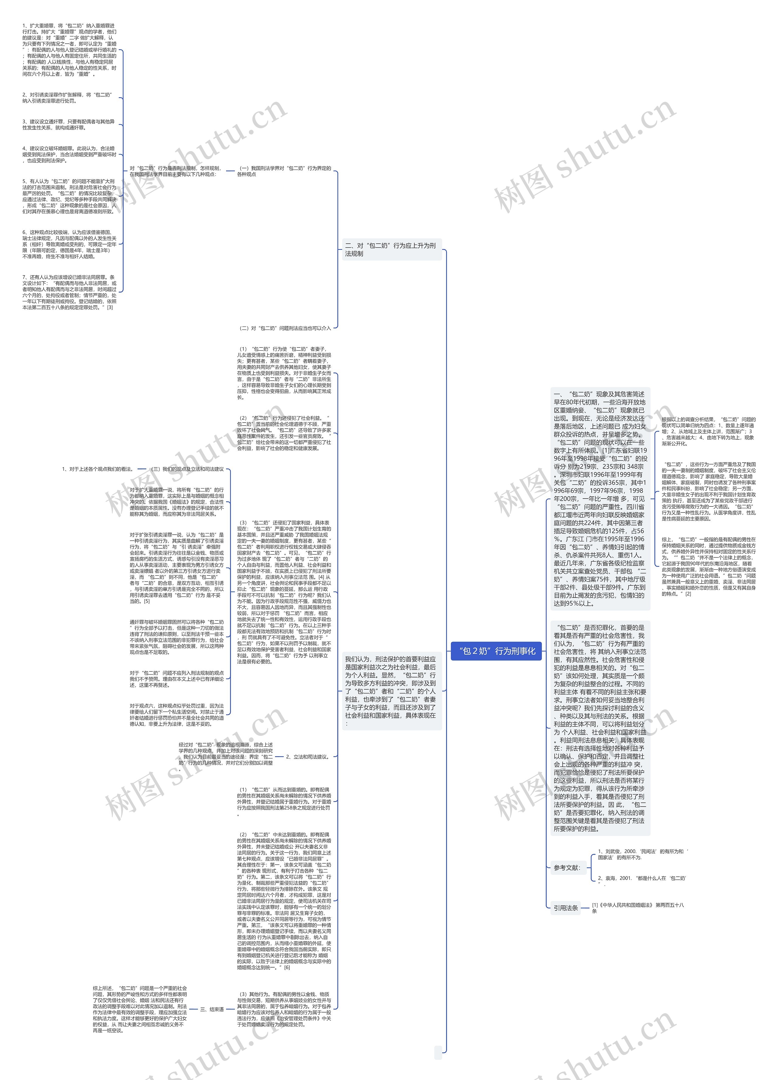 综上所述,“包二奶”问题是一个严重的社会问题,其形势的严峻性和方式的多样性都表明了仅仅凭借社会舆论、婚姻 法和民法还有行政法的调整手段难以对此情况加以遏制。刑法作为法律中最有效的调整手段,理应加强立法和执法力度。这样才能够更好的保护广大妇女的权益,从 而让夫妻之间相互忠诚的义务不再是一纸空谈。